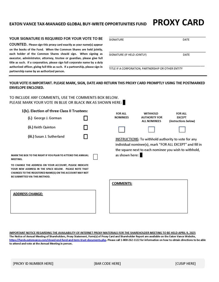 | b. | For Eaton Vance Tax-Managed Buy-Write Income Fund, Eaton Vance Tax-Managed Buy-Write Opportunities Fund and Eaton Vance Tax-Managed Global Buy-Write Opportunities Fund, three Class II Trustees, George J. Gorman, Keith Quinton and Susan J. Sutherland, to be elected by shareholders of each Fund. | ||