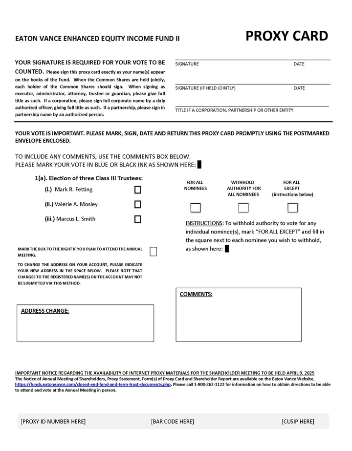| a. | For Eaton Vance Enhanced Equity Income Fund II and Eaton Vance Risk-Managed Diversified Equity Income Fund, three Class III Trustees, Mark R. Fetting, Valerie A. Mosley and Marcus L. Smith, to be elected by shareholders of each Fund; and | ||