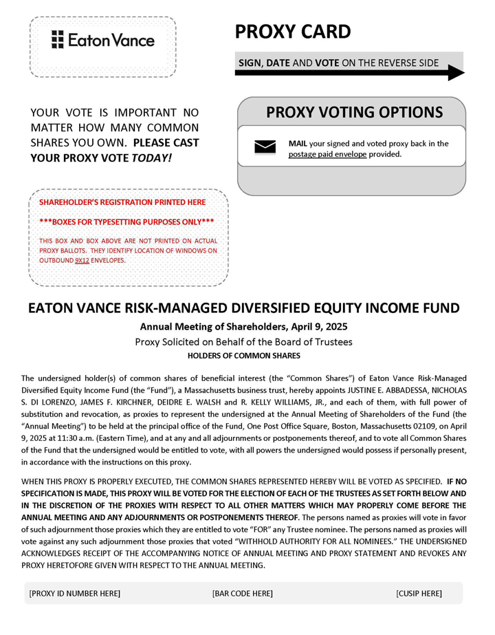 This proxy statement is furnished in connection with the solicitation of proxies by the Board of Trustees of each of Eaton Vance Enhanced Equity Income Fund II (the “Enhanced Equity Fund”), Eaton Vance Risk-Managed Diversified Equity Income Fund (the “Risk-Managed Fund”), Eaton Vance Tax-Managed Buy-Write Income Fund (the “Buy-Write Income Fund”), Eaton Vance Tax-Managed Buy-Write Opportunities Fund (the “Buy-Write Opportunities Fund”) and Eaton Vance Tax-Managed Global Buy-Write Opportunities Fund (the “Global Buy-Write Opportunities Fund”) (collectively, the “Funds”). The proxies will be voted at the Annual Meeting of Shareholders of each Fund and at any adjournments or postponements thereof (the “Annual Meeting”). The Annual Meeting will be held on Wednesday, April 9, 2025 at 11:30 a.m. (Eastern Time) at the principal office of each Fund, One Post Office Square, Boston, Massachusetts 02109, as discussed further herein. The Annual Meeting will be held for the purposes set forth in the accompanying notice. This proxy statement and the enclosed proxy card(s) are first being sent or given to shareholders on or about February 26, 2025.