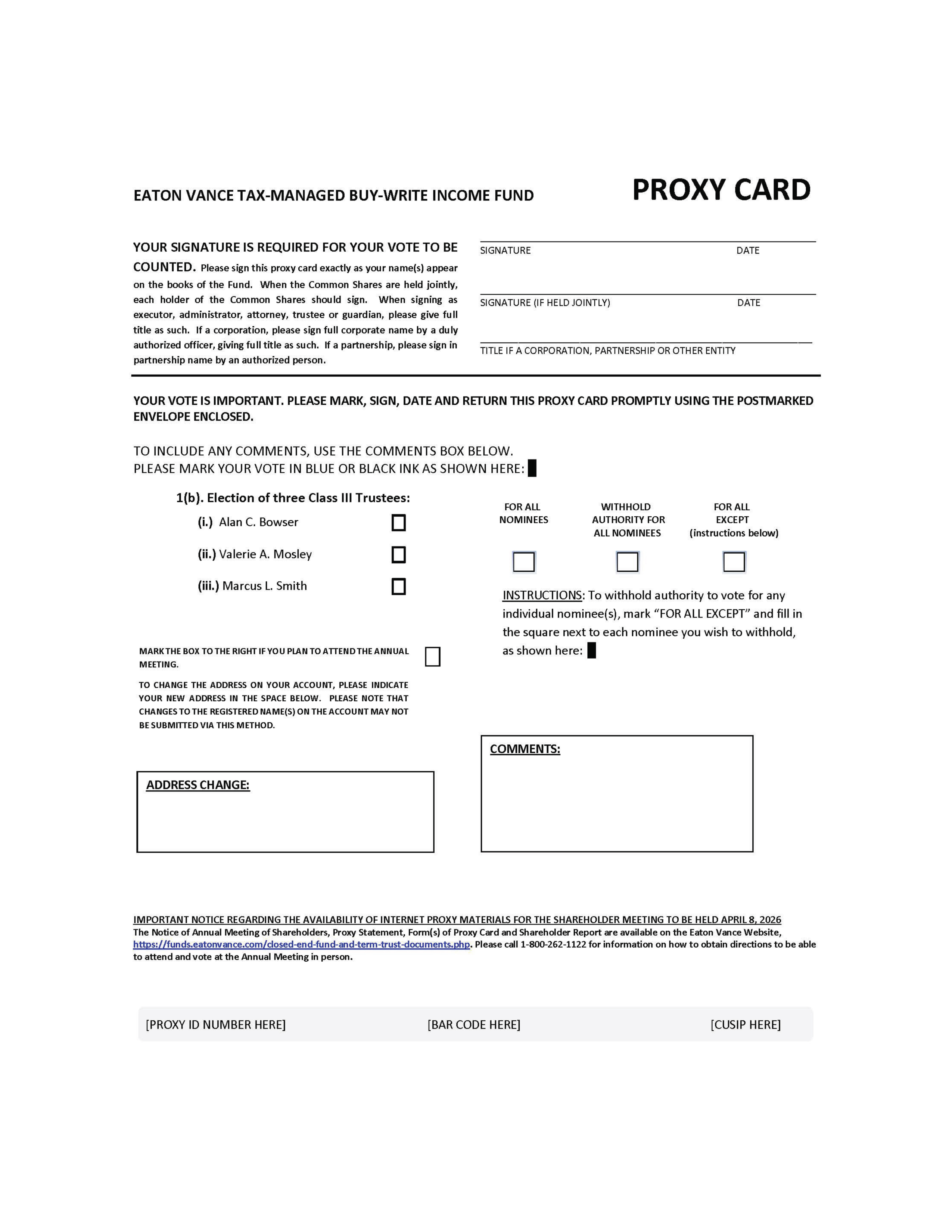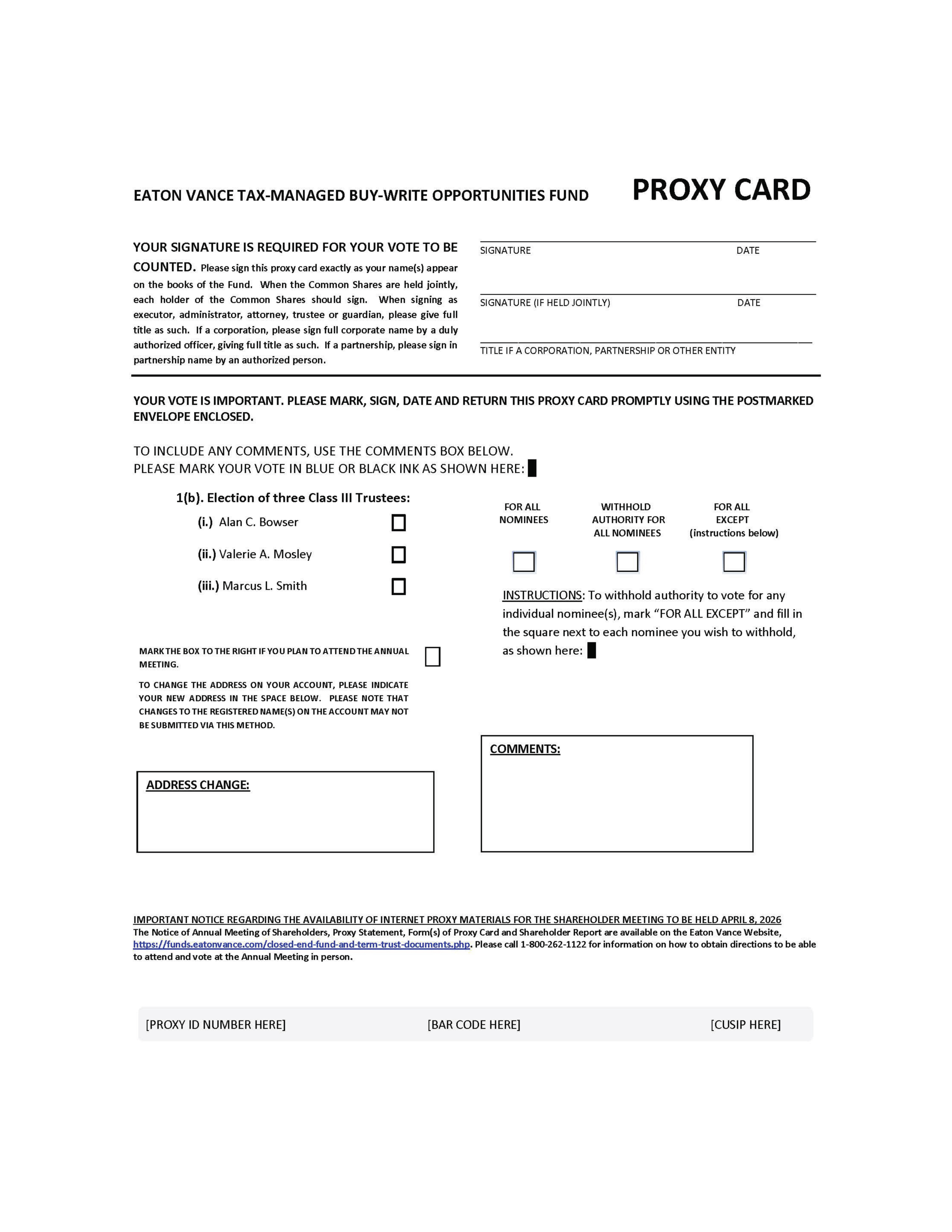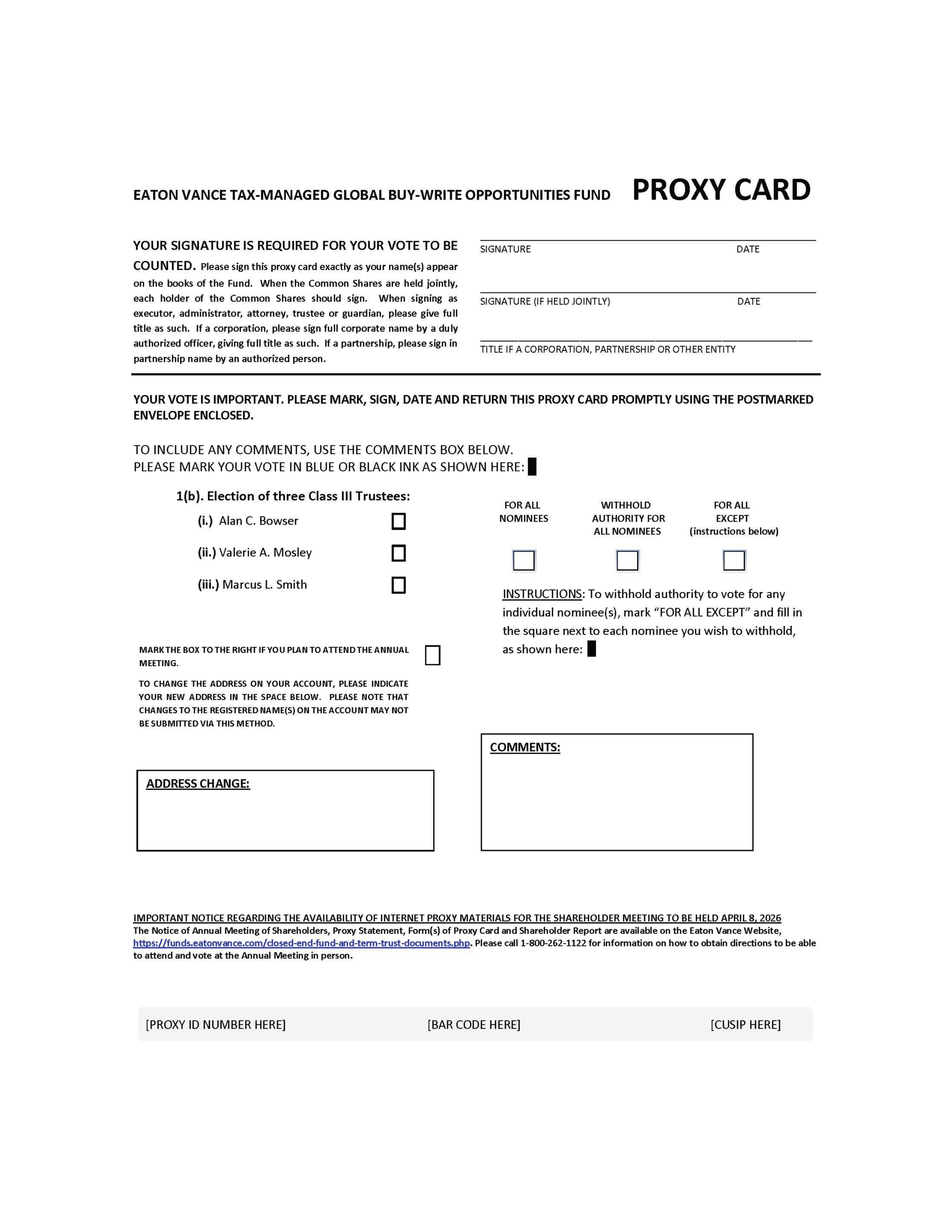 | b. | For Eaton Vance Tax-Managed Buy-Write Income Fund, Eaton Vance Tax-Managed Buy-Write Opportunities Fund and Eaton Vance Tax-Managed Global Buy-Write Opportunities Fund, three Class III Trustees, Alan C. Bowser, Valerie A. Mosley and Marcus L. Smith, to be elected by shareholders of each Fund. | ||