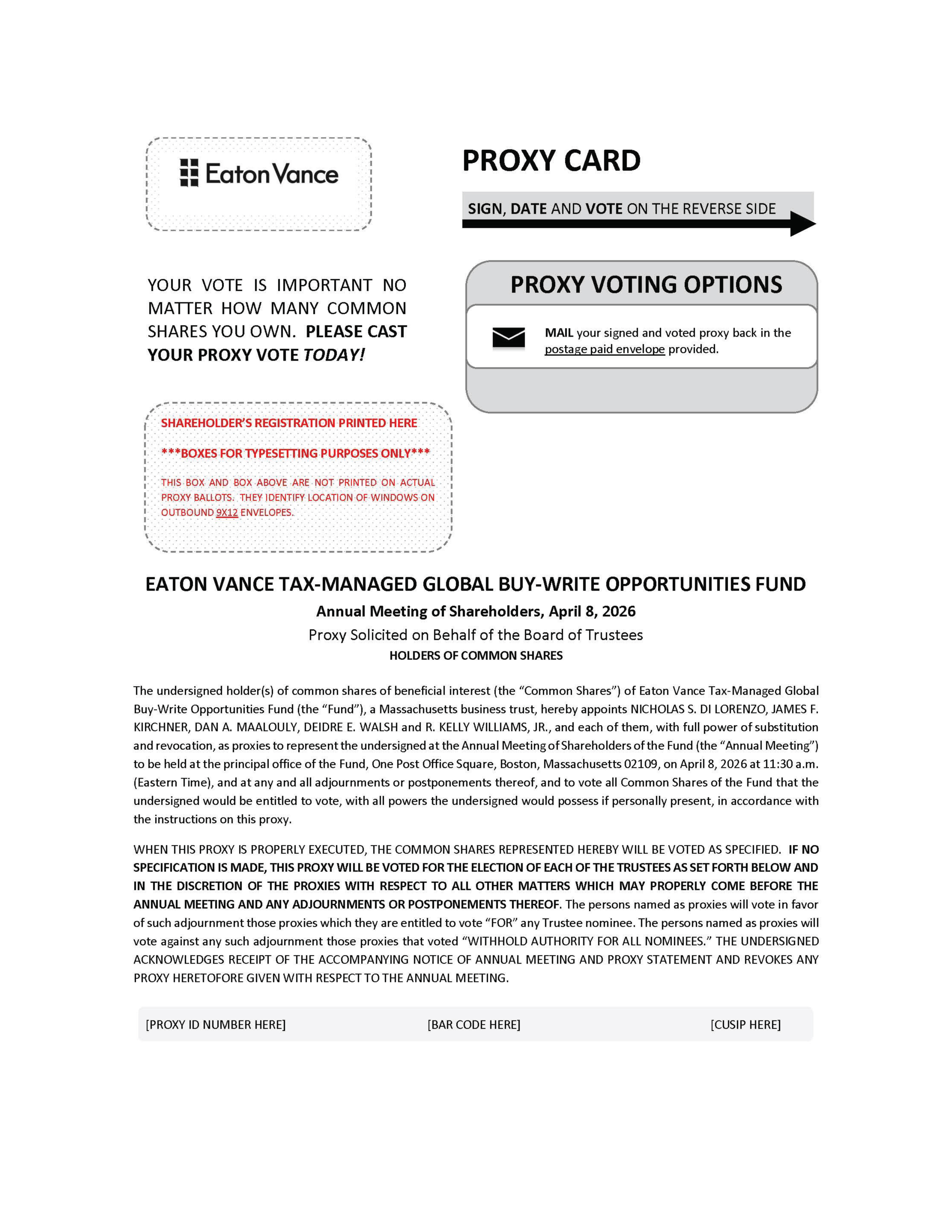 This proxy statement is furnished in connection with the solicitation of proxies by the Board of Trustees of each of Eaton Vance Enhanced Equity Income Fund II (the “Enhanced Equity Fund”), Eaton Vance Risk-Managed Diversified Equity Income Fund (the “Risk-Managed Fund”), Eaton Vance Tax-Managed Buy-Write Income Fund (the “Buy-Write Income Fund”), Eaton Vance Tax-Managed Buy-Write Opportunities Fund (the “Buy-Write Opportunities Fund”) and Eaton Vance Tax-Managed Global Buy-Write Opportunities Fund (the “Global Buy-Write Opportunities Fund”) (collectively, the “Funds”). The proxies will be voted at the Annual Meeting of Shareholders of each Fund and at any adjournments or postponements thereof (the “Annual Meeting”). The Annual Meeting will be held on Wednesday, April 8, 2026 at 11:30 a.m. (Eastern Time) at the principal office of each Fund, One Post Office Square, Boston, Massachusetts 02109, as discussed further herein. The Annual Meeting will be held for the purposes set forth in the accompanying notice. This proxy statement and the enclosed proxy card(s) are first being sent or given to shareholders on or about February 25, 2026.