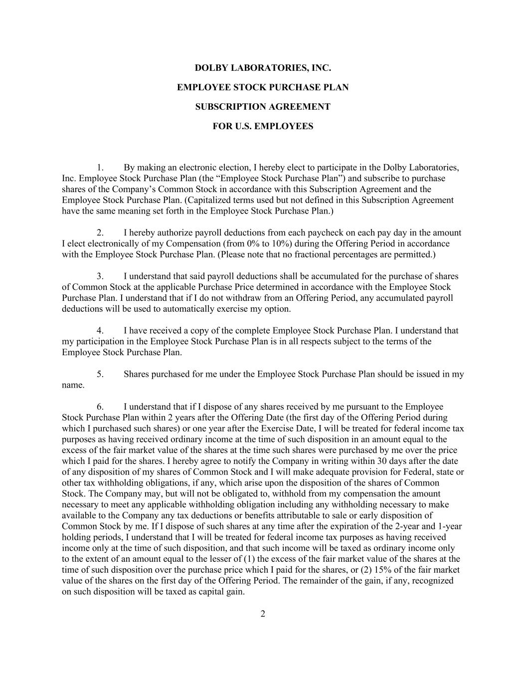 2 DOLBY LABORATORIES, INC. EMPLOYEE STOCK PURCHASE PLAN SUBSCRIPTION AGREEMENT FOR U.S. EMPLOYEES 1. By making an electronic election, I hereby elect to participate in the Dolby Laboratories, Inc. Employee Stock Purchase Plan (the “Employee Stock Purchase Plan”) and subscribe to purchase shares of the Company’s Common Stock in accordance with this Subscription Agreement and the Employee Stock Purchase Plan. (Capitalized terms used but not defined in this Subscription Agreement have the same meaning set forth in the Employee Stock Purchase Plan.) 2. I hereby authorize payroll deductions from each paycheck on each pay day in the amount I elect electronically of my Compensation (from 0% to 10%) during the Offering Period in accordance with the Employee Stock Purchase Plan. (Please note that no fractional percentages are permitted.) 3. I understand that said payroll deductions shall be accumulated for the purchase of shares of Common Stock at the applicable Purchase Price determined in accordance with the Employee Stock Purchase Plan. I understand that if I do not withdraw from an Offering Period, any accumulated payroll deductions will be used to automatically exercise my option. 4. I have received a copy of the complete Employee Stock Purchase Plan. I understand that my participation in the Employee Stock Purchase Plan is in all respects subject to the terms of the Employee Stock Purchase Plan. 5. Shares purchased for me under the Employee Stock Purchase Plan should be issued in my name. 6. I understand that if I dispose of any shares received by me pursuant to the Employee Stock Purchase Plan within 2 years after the Offering Date (the first day of the Offering Period during which I purchased such shares) or one year after the Exercise Date, I will be treated for federal income tax purposes as having received ordinary income at the time of such disposition in an amount equal to the excess of the fair market value of the shares at the time such shares were purchased by me over the price which I paid for the shares. I hereby agree to notify the Company in writing within 30 days after the date of any disposition of my shares of Common Stock and I will make adequate provision for Federal, state or other tax withholding obligations, if any, which arise upon the disposition of the shares of Common Stock. The Company may, but will not be obligated to, withhold from my compensation the amount necessary to meet any applicable withholding obligation including any withholding necessary to make available to the Company any tax deductions or benefits attributable to sale or early disposition of Common Stock by me. If I dispose of such shares at any time after the expiration of the 2-year and 1-year holding periods, I understand that I will be treated for federal income tax purposes as having received income only at the time of such disposition, and that such income will be taxed as ordinary income only to the extent of an amount equal to the lesser of (1) the excess of the fair market value of the shares at the time of such disposition over the purchase price which I paid for the shares, or (2) 15% of the fair market value of the shares on the first day of the Offering Period. The remainder of the gain, if any, recognized on such disposition will be taxed as capital gain.