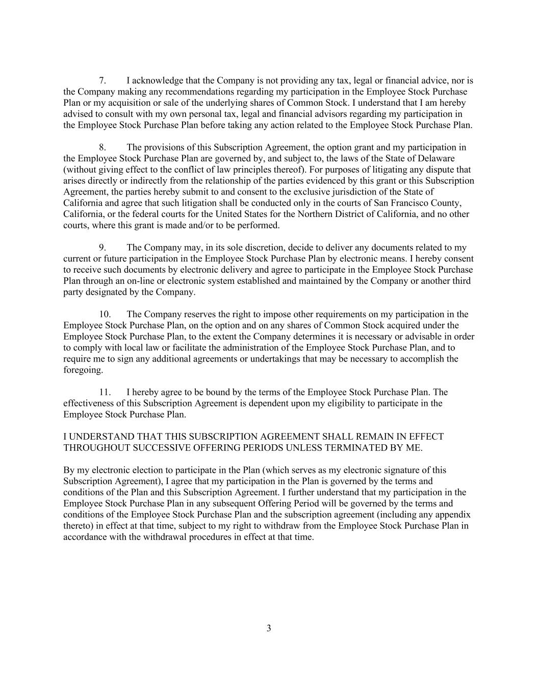 3 7. I acknowledge that the Company is not providing any tax, legal or financial advice, nor is the Company making any recommendations regarding my participation in the Employee Stock Purchase Plan or my acquisition or sale of the underlying shares of Common Stock. I understand that I am hereby advised to consult with my own personal tax, legal and financial advisors regarding my participation in the Employee Stock Purchase Plan before taking any action related to the Employee Stock Purchase Plan. 8. The provisions of this Subscription Agreement, the option grant and my participation in the Employee Stock Purchase Plan are governed by, and subject to, the laws of the State of Delaware (without giving effect to the conflict of law principles thereof). For purposes of litigating any dispute that arises directly or indirectly from the relationship of the parties evidenced by this grant or this Subscription Agreement, the parties hereby submit to and consent to the exclusive jurisdiction of the State of California and agree that such litigation shall be conducted only in the courts of San Francisco County, California, or the federal courts for the United States for the Northern District of California, and no other courts, where this grant is made and/or to be performed. 9. The Company may, in its sole discretion, decide to deliver any documents related to my current or future participation in the Employee Stock Purchase Plan by electronic means. I hereby consent to receive such documents by electronic delivery and agree to participate in the Employee Stock Purchase Plan through an on-line or electronic system established and maintained by the Company or another third party designated by the Company. 10. The Company reserves the right to impose other requirements on my participation in the Employee Stock Purchase Plan, on the option and on any shares of Common Stock acquired under the Employee Stock Purchase Plan, to the extent the Company determines it is necessary or advisable in order to comply with local law or facilitate the administration of the Employee Stock Purchase Plan, and to require me to sign any additional agreements or undertakings that may be necessary to accomplish the foregoing. 11. I hereby agree to be bound by the terms of the Employee Stock Purchase Plan. The effectiveness of this Subscription Agreement is dependent upon my eligibility to participate in the Employee Stock Purchase Plan. I UNDERSTAND THAT THIS SUBSCRIPTION AGREEMENT SHALL REMAIN IN EFFECT THROUGHOUT SUCCESSIVE OFFERING PERIODS UNLESS TERMINATED BY ME. By my electronic election to participate in the Plan (which serves as my electronic signature of this Subscription Agreement), I agree that my participation in the Plan is governed by the terms and conditions of the Plan and this Subscription Agreement. I further understand that my participation in the Employee Stock Purchase Plan in any subsequent Offering Period will be governed by the terms and conditions of the Employee Stock Purchase Plan and the subscription agreement (including any appendix thereto) in effect at that time, subject to my right to withdraw from the Employee Stock Purchase Plan in accordance with the withdrawal procedures in effect at that time.