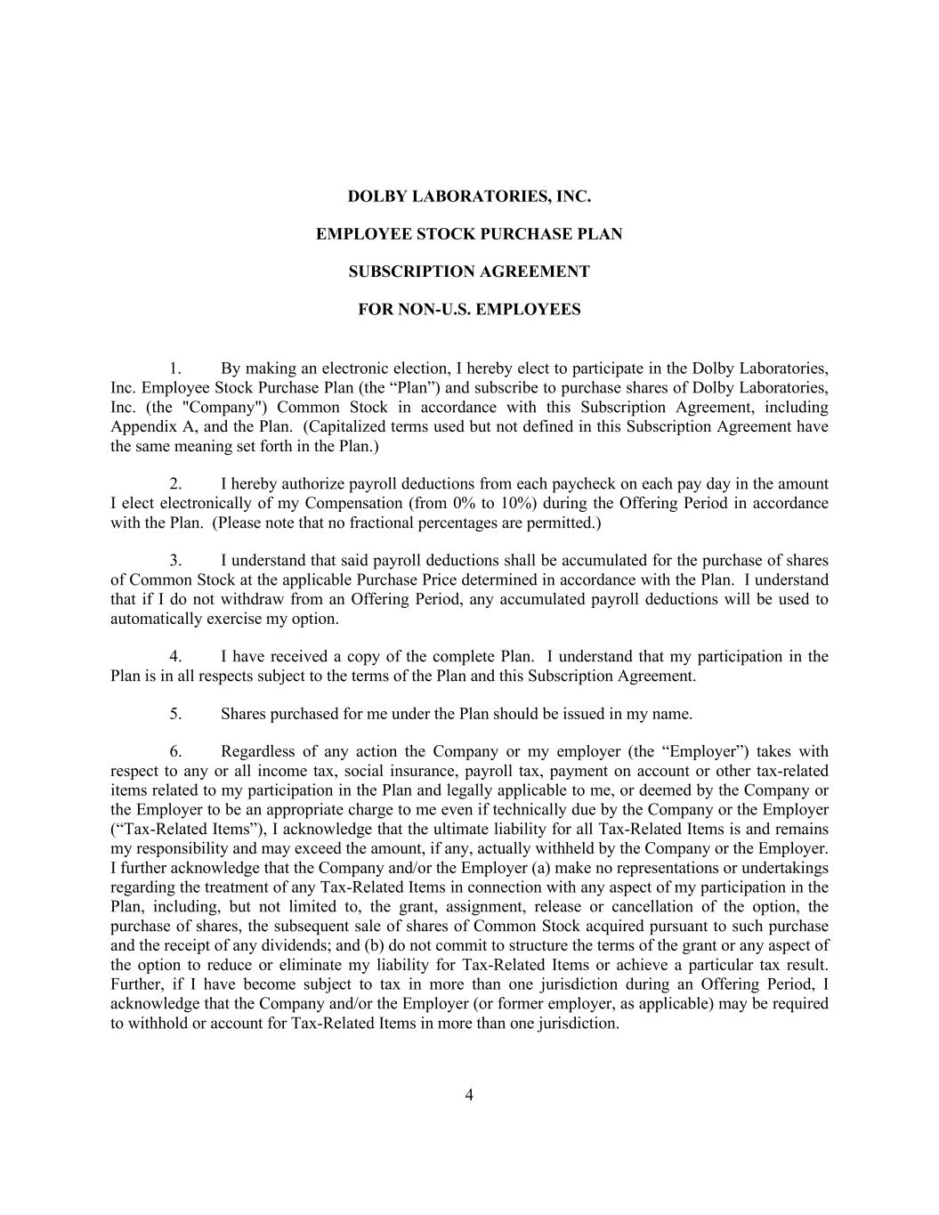 4 DOLBY LABORATORIES, INC. EMPLOYEE STOCK PURCHASE PLAN SUBSCRIPTION AGREEMENT FOR NON-U.S. EMPLOYEES 1. By making an electronic election, I hereby elect to participate in the Dolby Laboratories, Inc. Employee Stock Purchase Plan (the “Plan”) and subscribe to purchase shares of Dolby Laboratories, Inc. (the "Company") Common Stock in accordance with this Subscription Agreement, including Appendix A, and the Plan. (Capitalized terms used but not defined in this Subscription Agreement have the same meaning set forth in the Plan.) 2. I hereby authorize payroll deductions from each paycheck on each pay day in the amount I elect electronically of my Compensation (from 0% to 10%) during the Offering Period in accordance with the Plan. (Please note that no fractional percentages are permitted.) 3. I understand that said payroll deductions shall be accumulated for the purchase of shares of Common Stock at the applicable Purchase Price determined in accordance with the Plan. I understand that if I do not withdraw from an Offering Period, any accumulated payroll deductions will be used to automatically exercise my option. 4. I have received a copy of the complete Plan. I understand that my participation in the Plan is in all respects subject to the terms of the Plan and this Subscription Agreement. 5. Shares purchased for me under the Plan should be issued in my name. 6. Regardless of any action the Company or my employer (the “Employer”) takes with respect to any or all income tax, social insurance, payroll tax, payment on account or other tax-related items related to my participation in the Plan and legally applicable to me, or deemed by the Company or the Employer to be an appropriate charge to me even if technically due by the Company or the Employer (“Tax-Related Items”), I acknowledge that the ultimate liability for all Tax-Related Items is and remains my responsibility and may exceed the amount, if any, actually withheld by the Company or the Employer. I further acknowledge that the Company and/or the Employer (a) make no representations or undertakings regarding the treatment of any Tax-Related Items in connection with any aspect of my participation in the Plan, including, but not limited to, the grant, assignment, release or cancellation of the option, the purchase of shares, the subsequent sale of shares of Common Stock acquired pursuant to such purchase and the receipt of any dividends; and (b) do not commit to structure the terms of the grant or any aspect of the option to reduce or eliminate my liability for Tax-Related Items or achieve a particular tax result. Further, if I have become subject to tax in more than one jurisdiction during an Offering Period, I acknowledge that the Company and/or the Employer (or former employer, as applicable) may be required to withhold or account for Tax-Related Items in more than one jurisdiction.