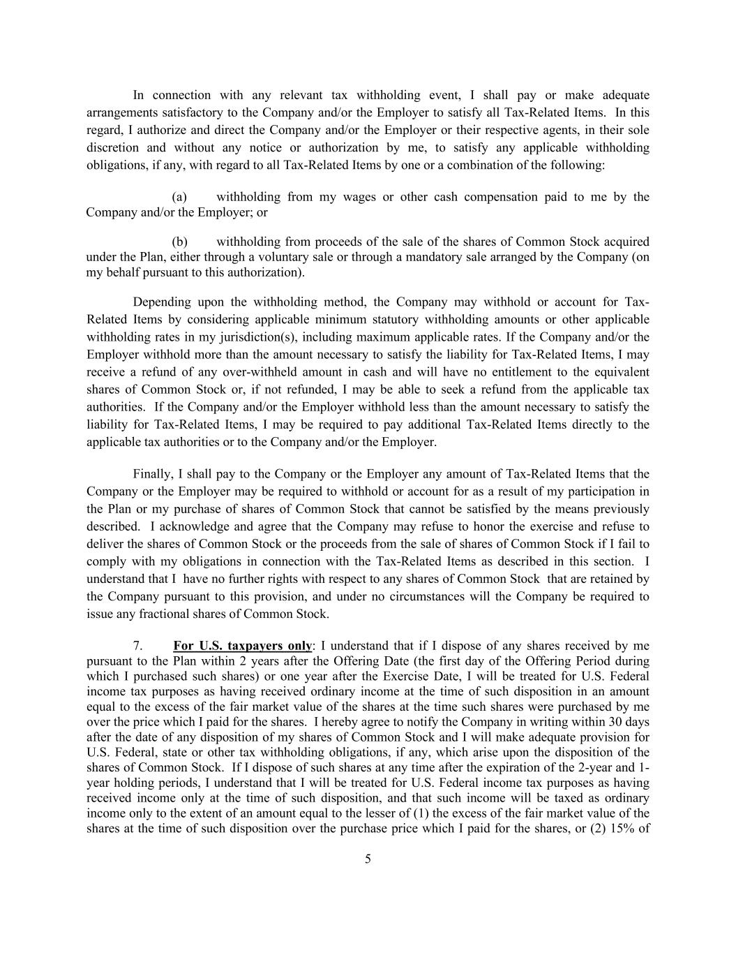 5 In connection with any relevant tax withholding event, I shall pay or make adequate arrangements satisfactory to the Company and/or the Employer to satisfy all Tax-Related Items. In this regard, I authorize and direct the Company and/or the Employer or their respective agents, in their sole discretion and without any notice or authorization by me, to satisfy any applicable withholding obligations, if any, with regard to all Tax-Related Items by one or a combination of the following: (a) withholding from my wages or other cash compensation paid to me by the Company and/or the Employer; or (b) withholding from proceeds of the sale of the shares of Common Stock acquired under the Plan, either through a voluntary sale or through a mandatory sale arranged by the Company (on my behalf pursuant to this authorization). Depending upon the withholding method, the Company may withhold or account for Tax- Related Items by considering applicable minimum statutory withholding amounts or other applicable withholding rates in my jurisdiction(s), including maximum applicable rates. If the Company and/or the Employer withhold more than the amount necessary to satisfy the liability for Tax-Related Items, I may receive a refund of any over-withheld amount in cash and will have no entitlement to the equivalent shares of Common Stock or, if not refunded, I may be able to seek a refund from the applicable tax authorities. If the Company and/or the Employer withhold less than the amount necessary to satisfy the liability for Tax-Related Items, I may be required to pay additional Tax-Related Items directly to the applicable tax authorities or to the Company and/or the Employer. Finally, I shall pay to the Company or the Employer any amount of Tax-Related Items that the Company or the Employer may be required to withhold or account for as a result of my participation in the Plan or my purchase of shares of Common Stock that cannot be satisfied by the means previously described. I acknowledge and agree that the Company may refuse to honor the exercise and refuse to deliver the shares of Common Stock or the proceeds from the sale of shares of Common Stock if I fail to comply with my obligations in connection with the Tax-Related Items as described in this section. I understand that I have no further rights with respect to any shares of Common Stock that are retained by the Company pursuant to this provision, and under no circumstances will the Company be required to issue any fractional shares of Common Stock. 7. For U.S. taxpayers only: I understand that if I dispose of any shares received by me pursuant to the Plan within 2 years after the Offering Date (the first day of the Offering Period during which I purchased such shares) or one year after the Exercise Date, I will be treated for U.S. Federal income tax purposes as having received ordinary income at the time of such disposition in an amount equal to the excess of the fair market value of the shares at the time such shares were purchased by me over the price which I paid for the shares. I hereby agree to notify the Company in writing within 30 days after the date of any disposition of my shares of Common Stock and I will make adequate provision for U.S. Federal, state or other tax withholding obligations, if any, which arise upon the disposition of the shares of Common Stock. If I dispose of such shares at any time after the expiration of the 2-year and 1- year holding periods, I understand that I will be treated for U.S. Federal income tax purposes as having received income only at the time of such disposition, and that such income will be taxed as ordinary income only to the extent of an amount equal to the lesser of (1) the excess of the fair market value of the shares at the time of such disposition over the purchase price which I paid for the shares, or (2) 15% of