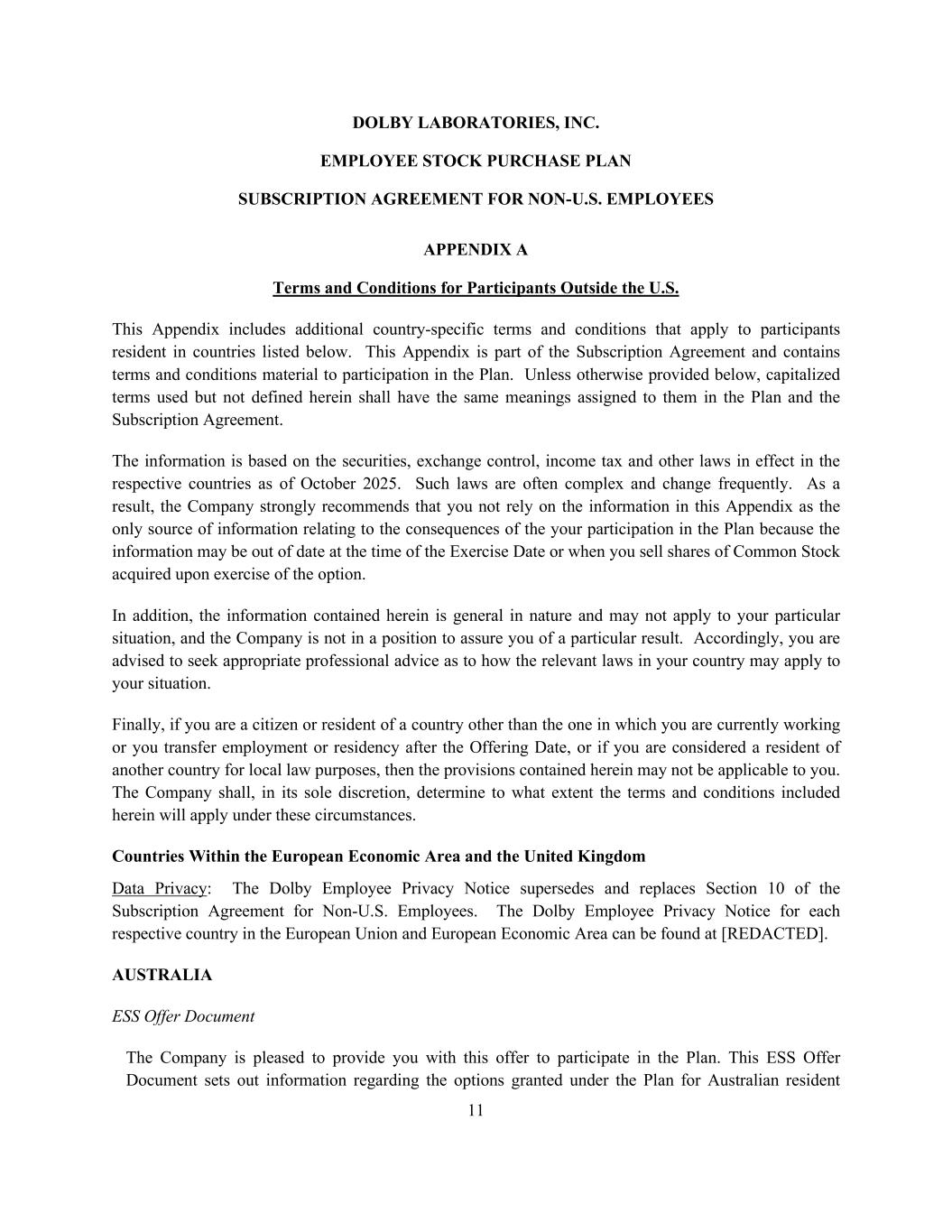 11 DOLBY LABORATORIES, INC. EMPLOYEE STOCK PURCHASE PLAN SUBSCRIPTION AGREEMENT FOR NON-U.S. EMPLOYEES APPENDIX A Terms and Conditions for Participants Outside the U.S. This Appendix includes additional country-specific terms and conditions that apply to participants resident in countries listed below. This Appendix is part of the Subscription Agreement and contains terms and conditions material to participation in the Plan. Unless otherwise provided below, capitalized terms used but not defined herein shall have the same meanings assigned to them in the Plan and the Subscription Agreement. The information is based on the securities, exchange control, income tax and other laws in effect in the respective countries as of October 2025. Such laws are often complex and change frequently. As a result, the Company strongly recommends that you not rely on the information in this Appendix as the only source of information relating to the consequences of the your participation in the Plan because the information may be out of date at the time of the Exercise Date or when you sell shares of Common Stock acquired upon exercise of the option. In addition, the information contained herein is general in nature and may not apply to your particular situation, and the Company is not in a position to assure you of a particular result. Accordingly, you are advised to seek appropriate professional advice as to how the relevant laws in your country may apply to your situation. Finally, if you are a citizen or resident of a country other than the one in which you are currently working or you transfer employment or residency after the Offering Date, or if you are considered a resident of another country for local law purposes, then the provisions contained herein may not be applicable to you. The Company shall, in its sole discretion, determine to what extent the terms and conditions included herein will apply under these circumstances. Countries Within the European Economic Area and the United Kingdom Data Privacy: The Dolby Employee Privacy Notice supersedes and replaces Section 10 of the Subscription Agreement for Non-U.S. Employees. The Dolby Employee Privacy Notice for each respective country in the European Union and European Economic Area can be found at [REDACTED]. AUSTRALIA ESS Offer Document The Company is pleased to provide you with this offer to participate in the Plan. This ESS Offer Document sets out information regarding the options granted under the Plan for Australian resident
