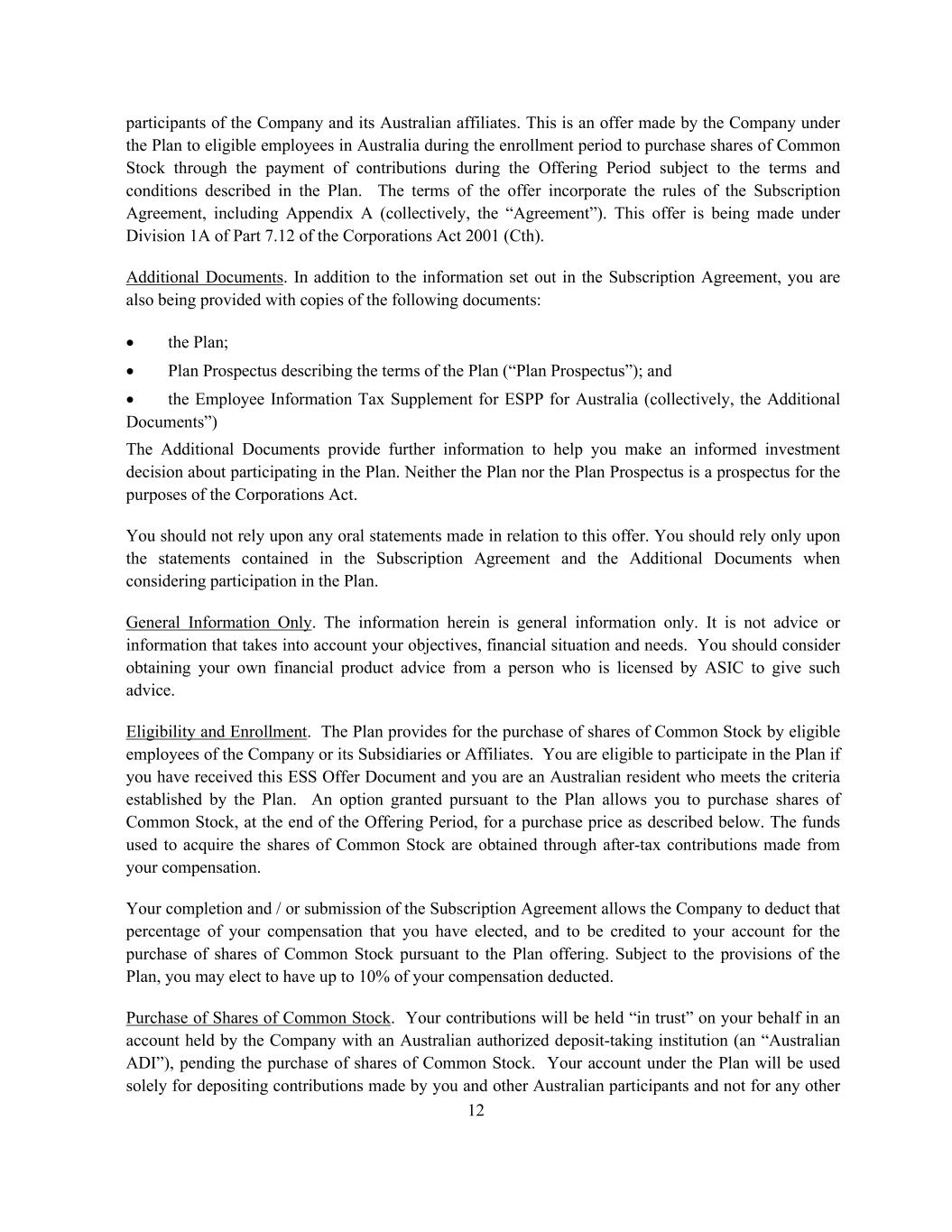 12 participants of the Company and its Australian affiliates. This is an offer made by the Company under the Plan to eligible employees in Australia during the enrollment period to purchase shares of Common Stock through the payment of contributions during the Offering Period subject to the terms and conditions described in the Plan. The terms of the offer incorporate the rules of the Subscription Agreement, including Appendix A (collectively, the “Agreement”). This offer is being made under Division 1A of Part 7.12 of the Corporations Act 2001 (Cth). Additional Documents. In addition to the information set out in the Subscription Agreement, you are also being provided with copies of the following documents: • the Plan; • Plan Prospectus describing the terms of the Plan (“Plan Prospectus”); and • the Employee Information Tax Supplement for ESPP for Australia (collectively, the Additional Documents”) The Additional Documents provide further information to help you make an informed investment decision about participating in the Plan. Neither the Plan nor the Plan Prospectus is a prospectus for the purposes of the Corporations Act. You should not rely upon any oral statements made in relation to this offer. You should rely only upon the statements contained in the Subscription Agreement and the Additional Documents when considering participation in the Plan. General Information Only. The information herein is general information only. It is not advice or information that takes into account your objectives, financial situation and needs. You should consider obtaining your own financial product advice from a person who is licensed by ASIC to give such advice. Eligibility and Enrollment. The Plan provides for the purchase of shares of Common Stock by eligible employees of the Company or its Subsidiaries or Affiliates. You are eligible to participate in the Plan if you have received this ESS Offer Document and you are an Australian resident who meets the criteria established by the Plan. An option granted pursuant to the Plan allows you to purchase shares of Common Stock, at the end of the Offering Period, for a purchase price as described below. The funds used to acquire the shares of Common Stock are obtained through after-tax contributions made from your compensation. Your completion and / or submission of the Subscription Agreement allows the Company to deduct that percentage of your compensation that you have elected, and to be credited to your account for the purchase of shares of Common Stock pursuant to the Plan offering. Subject to the provisions of the Plan, you may elect to have up to 10% of your compensation deducted. Purchase of Shares of Common Stock. Your contributions will be held “in trust” on your behalf in an account held by the Company with an Australian authorized deposit-taking institution (an “Australian ADI”), pending the purchase of shares of Common Stock. Your account under the Plan will be used solely for depositing contributions made by you and other Australian participants and not for any other