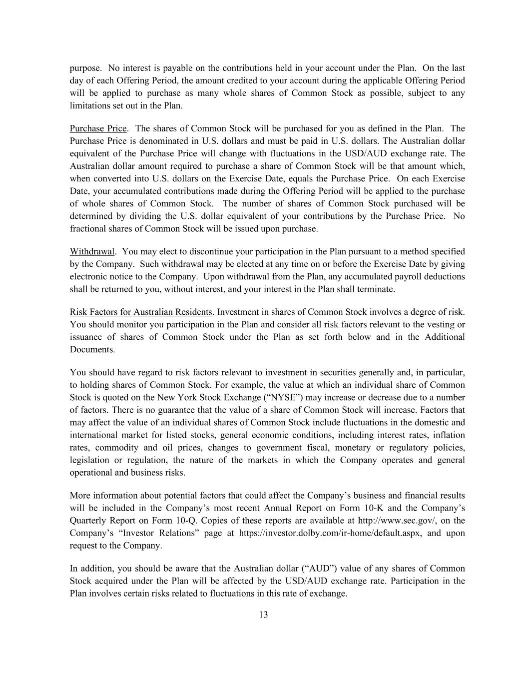 13 purpose. No interest is payable on the contributions held in your account under the Plan. On the last day of each Offering Period, the amount credited to your account during the applicable Offering Period will be applied to purchase as many whole shares of Common Stock as possible, subject to any limitations set out in the Plan. Purchase Price. The shares of Common Stock will be purchased for you as defined in the Plan. The Purchase Price is denominated in U.S. dollars and must be paid in U.S. dollars. The Australian dollar equivalent of the Purchase Price will change with fluctuations in the USD/AUD exchange rate. The Australian dollar amount required to purchase a share of Common Stock will be that amount which, when converted into U.S. dollars on the Exercise Date, equals the Purchase Price. On each Exercise Date, your accumulated contributions made during the Offering Period will be applied to the purchase of whole shares of Common Stock. The number of shares of Common Stock purchased will be determined by dividing the U.S. dollar equivalent of your contributions by the Purchase Price. No fractional shares of Common Stock will be issued upon purchase. Withdrawal. You may elect to discontinue your participation in the Plan pursuant to a method specified by the Company. Such withdrawal may be elected at any time on or before the Exercise Date by giving electronic notice to the Company. Upon withdrawal from the Plan, any accumulated payroll deductions shall be returned to you, without interest, and your interest in the Plan shall terminate. Risk Factors for Australian Residents. Investment in shares of Common Stock involves a degree of risk. You should monitor you participation in the Plan and consider all risk factors relevant to the vesting or issuance of shares of Common Stock under the Plan as set forth below and in the Additional Documents. You should have regard to risk factors relevant to investment in securities generally and, in particular, to holding shares of Common Stock. For example, the value at which an individual share of Common Stock is quoted on the New York Stock Exchange (“NYSE”) may increase or decrease due to a number of factors. There is no guarantee that the value of a share of Common Stock will increase. Factors that may affect the value of an individual shares of Common Stock include fluctuations in the domestic and international market for listed stocks, general economic conditions, including interest rates, inflation rates, commodity and oil prices, changes to government fiscal, monetary or regulatory policies, legislation or regulation, the nature of the markets in which the Company operates and general operational and business risks. More information about potential factors that could affect the Company’s business and financial results will be included in the Company’s most recent Annual Report on Form 10-K and the Company’s Quarterly Report on Form 10-Q. Copies of these reports are available at http://www.sec.gov/, on the Company’s “Investor Relations” page at https://investor.dolby.com/ir-home/default.aspx, and upon request to the Company. In addition, you should be aware that the Australian dollar (“AUD”) value of any shares of Common Stock acquired under the Plan will be affected by the USD/AUD exchange rate. Participation in the Plan involves certain risks related to fluctuations in this rate of exchange.