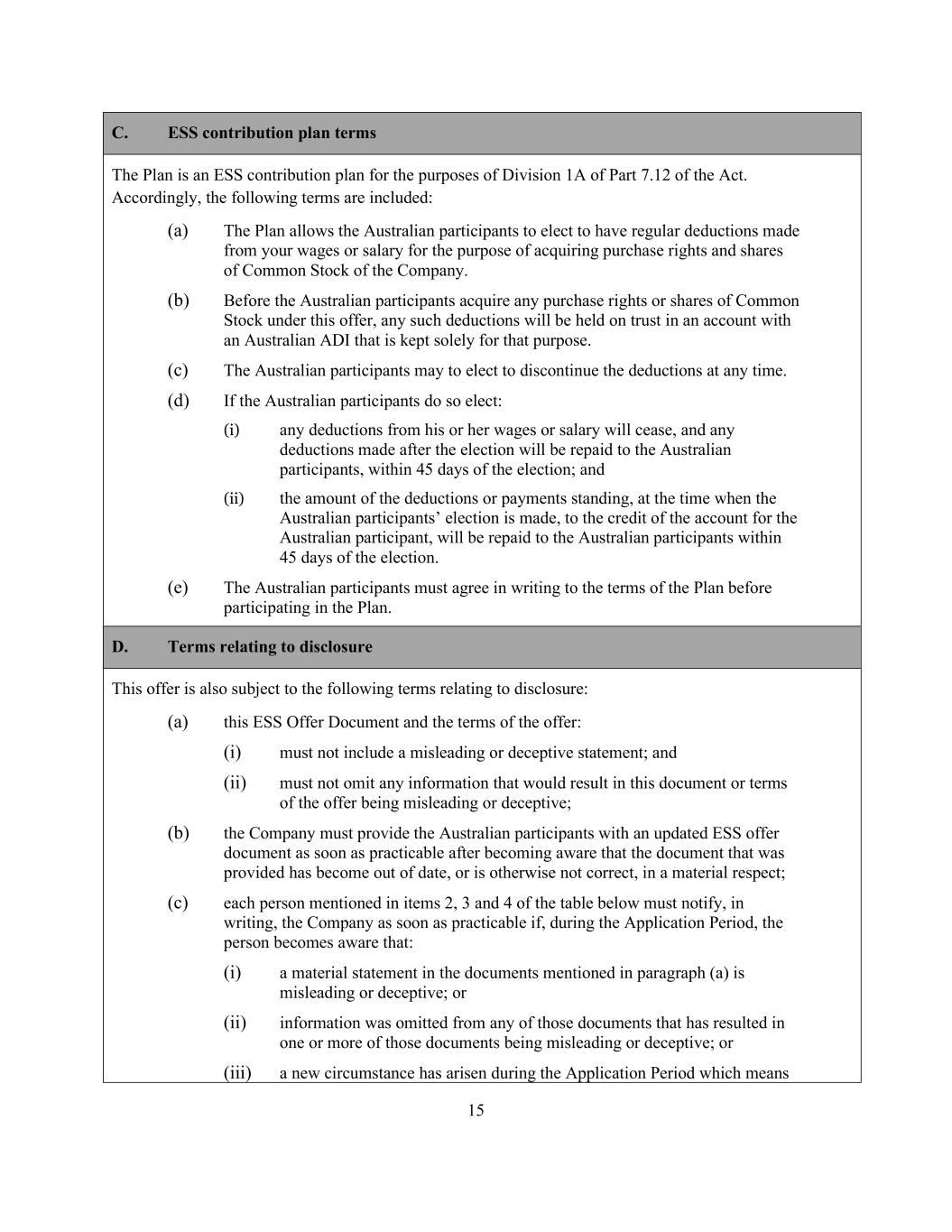15 C. ESS contribution plan terms The Plan is an ESS contribution plan for the purposes of Division 1A of Part 7.12 of the Act. Accordingly, the following terms are included: (a) The Plan allows the Australian participants to elect to have regular deductions made from your wages or salary for the purpose of acquiring purchase rights and shares of Common Stock of the Company. (b) Before the Australian participants acquire any purchase rights or shares of Common Stock under this offer, any such deductions will be held on trust in an account with an Australian ADI that is kept solely for that purpose. (c) The Australian participants may to elect to discontinue the deductions at any time. (d) If the Australian participants do so elect: (i) any deductions from his or her wages or salary will cease, and any deductions made after the election will be repaid to the Australian participants, within 45 days of the election; and (ii) the amount of the deductions or payments standing, at the time when the Australian participants’ election is made, to the credit of the account for the Australian participant, will be repaid to the Australian participants within 45 days of the election. (e) The Australian participants must agree in writing to the terms of the Plan before participating in the Plan. D. Terms relating to disclosure This offer is also subject to the following terms relating to disclosure: (a) this ESS Offer Document and the terms of the offer: (i) must not include a misleading or deceptive statement; and (ii) must not omit any information that would result in this document or terms of the offer being misleading or deceptive; (b) the Company must provide the Australian participants with an updated ESS offer document as soon as practicable after becoming aware that the document that was provided has become out of date, or is otherwise not correct, in a material respect; (c) each person mentioned in items 2, 3 and 4 of the table below must notify, in writing, the Company as soon as practicable if, during the Application Period, the person becomes aware that: (i) a material statement in the documents mentioned in paragraph (a) is misleading or deceptive; or (ii) information was omitted from any of those documents that has resulted in one or more of those documents being misleading or deceptive; or (iii) a new circumstance has arisen during the Application Period which means