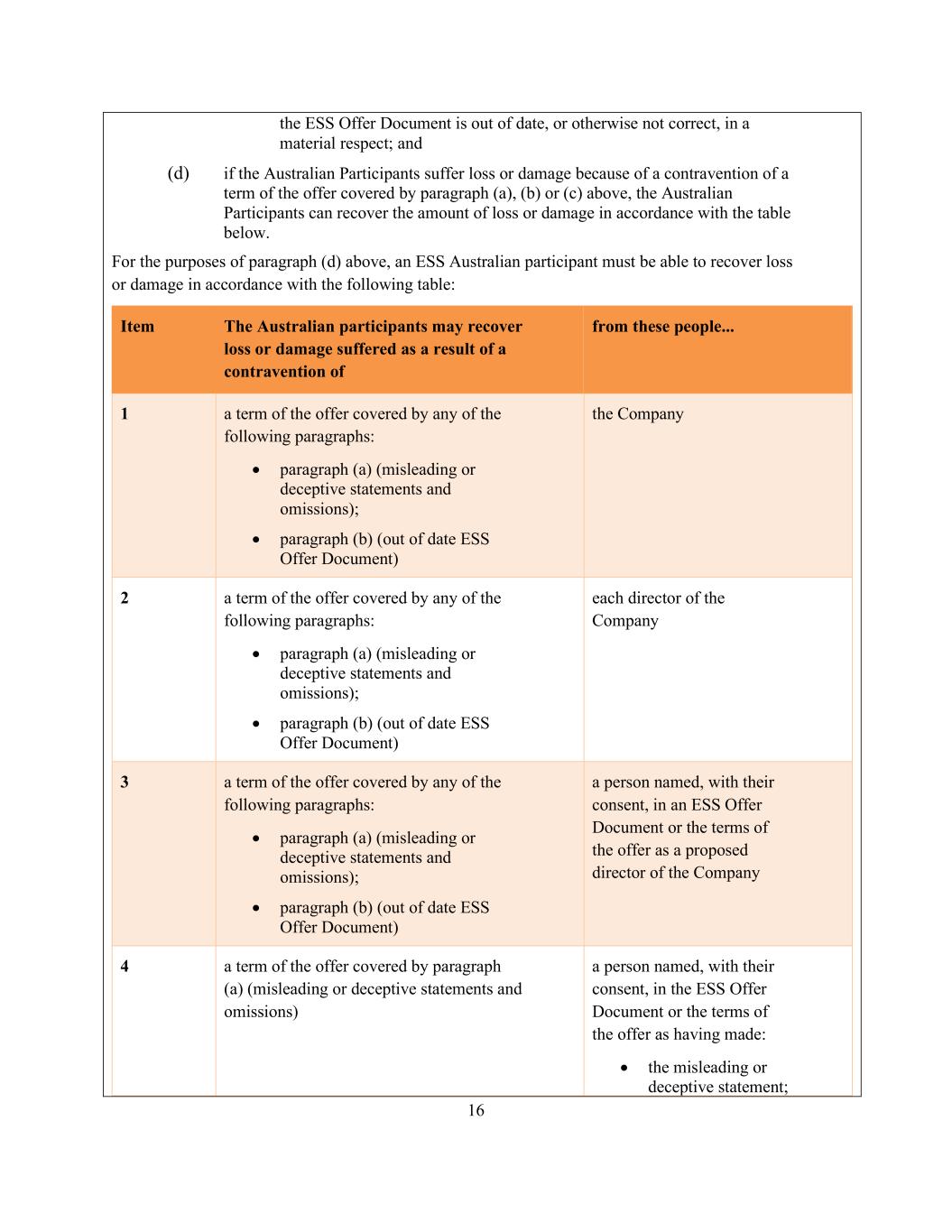 16 the ESS Offer Document is out of date, or otherwise not correct, in a material respect; and (d) if the Australian Participants suffer loss or damage because of a contravention of a term of the offer covered by paragraph (a), (b) or (c) above, the Australian Participants can recover the amount of loss or damage in accordance with the table below. For the purposes of paragraph (d) above, an ESS Australian participant must be able to recover loss or damage in accordance with the following table: Item The Australian participants may recover loss or damage suffered as a result of a contravention of from these people... 1 a term of the offer covered by any of the following paragraphs: • paragraph (a) (misleading or deceptive statements and omissions); • paragraph (b) (out of date ESS Offer Document) the Company 2 a term of the offer covered by any of the following paragraphs: • paragraph (a) (misleading or deceptive statements and omissions); • paragraph (b) (out of date ESS Offer Document) each director of the Company 3 a term of the offer covered by any of the following paragraphs: • paragraph (a) (misleading or deceptive statements and omissions); • paragraph (b) (out of date ESS Offer Document) a person named, with their consent, in an ESS Offer Document or the terms of the offer as a proposed director of the Company 4 a term of the offer covered by paragraph (a) (misleading or deceptive statements and omissions) a person named, with their consent, in the ESS Offer Document or the terms of the offer as having made: • the misleading or deceptive statement;