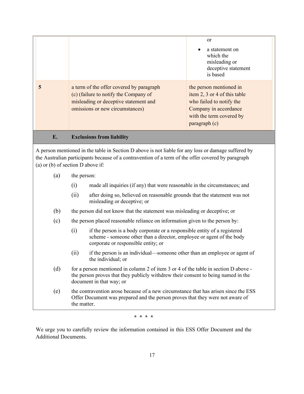 17 or • a statement on which the misleading or deceptive statement is based 5 a term of the offer covered by paragraph (c) (failure to notify the Company of misleading or deceptive statement and omissions or new circumstances) the person mentioned in item 2, 3 or 4 of this table who failed to notify the Company in accordance with the term covered by paragraph (c) E. Exclusions from liability A person mentioned in the table in Section D above is not liable for any loss or damage suffered by the Australian participants because of a contravention of a term of the offer covered by paragraph (a) or (b) of section D above if: (a) the person: (i) made all inquiries (if any) that were reasonable in the circumstances; and (ii) after doing so, believed on reasonable grounds that the statement was not misleading or deceptive; or (b) the person did not know that the statement was misleading or deceptive; or (c) the person placed reasonable reliance on information given to the person by: (i) if the person is a body corporate or a responsible entity of a registered scheme - someone other than a director, employee or agent of the body corporate or responsible entity; or (ii) if the person is an individual—someone other than an employee or agent of the individual; or (d) for a person mentioned in column 2 of item 3 or 4 of the table in section D above - the person proves that they publicly withdrew their consent to being named in the document in that way; or (e) the contravention arose because of a new circumstance that has arisen since the ESS Offer Document was prepared and the person proves that they were not aware of the matter. * * * * We urge you to carefully review the information contained in this ESS Offer Document and the Additional Documents.