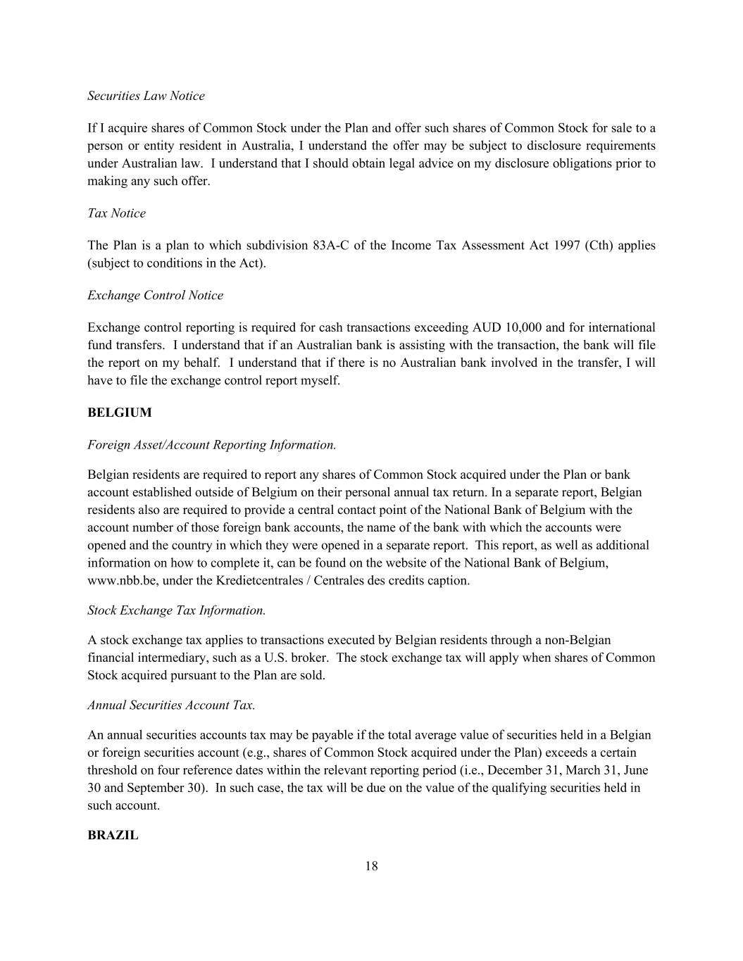 18 Securities Law Notice If I acquire shares of Common Stock under the Plan and offer such shares of Common Stock for sale to a person or entity resident in Australia, I understand the offer may be subject to disclosure requirements under Australian law. I understand that I should obtain legal advice on my disclosure obligations prior to making any such offer. Tax Notice The Plan is a plan to which subdivision 83A-C of the Income Tax Assessment Act 1997 (Cth) applies (subject to conditions in the Act). Exchange Control Notice Exchange control reporting is required for cash transactions exceeding AUD 10,000 and for international fund transfers. I understand that if an Australian bank is assisting with the transaction, the bank will file the report on my behalf. I understand that if there is no Australian bank involved in the transfer, I will have to file the exchange control report myself. BELGIUM Foreign Asset/Account Reporting Information. Belgian residents are required to report any shares of Common Stock acquired under the Plan or bank account established outside of Belgium on their personal annual tax return. In a separate report, Belgian residents also are required to provide a central contact point of the National Bank of Belgium with the account number of those foreign bank accounts, the name of the bank with which the accounts were opened and the country in which they were opened in a separate report. This report, as well as additional information on how to complete it, can be found on the website of the National Bank of Belgium, www.nbb.be, under the Kredietcentrales / Centrales des credits caption. Stock Exchange Tax Information. A stock exchange tax applies to transactions executed by Belgian residents through a non-Belgian financial intermediary, such as a U.S. broker. The stock exchange tax will apply when shares of Common Stock acquired pursuant to the Plan are sold. Annual Securities Account Tax. An annual securities accounts tax may be payable if the total average value of securities held in a Belgian or foreign securities account (e.g., shares of Common Stock acquired under the Plan) exceeds a certain threshold on four reference dates within the relevant reporting period (i.e., December 31, March 31, June 30 and September 30). In such case, the tax will be due on the value of the qualifying securities held in such account. BRAZIL