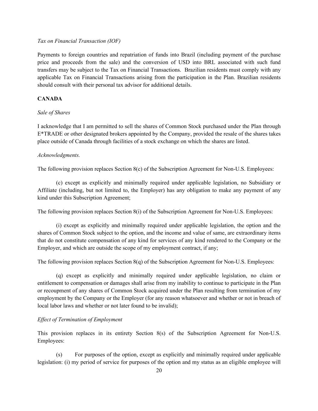 20 Tax on Financial Transaction (IOF) Payments to foreign countries and repatriation of funds into Brazil (including payment of the purchase price and proceeds from the sale) and the conversion of USD into BRL associated with such fund transfers may be subject to the Tax on Financial Transactions. Brazilian residents must comply with any applicable Tax on Financial Transactions arising from the participation in the Plan. Brazilian residents should consult with their personal tax advisor for additional details. CANADA Sale of Shares I acknowledge that I am permitted to sell the shares of Common Stock purchased under the Plan through E*TRADE or other designated brokers appointed by the Company, provided the resale of the shares takes place outside of Canada through facilities of a stock exchange on which the shares are listed. Acknowledgments. The following provision replaces Section 8(c) of the Subscription Agreement for Non-U.S. Employees: (c) except as explicitly and minimally required under applicable legislation, no Subsidiary or Affiliate (including, but not limited to, the Employer) has any obligation to make any payment of any kind under this Subscription Agreement; The following provision replaces Section 8(i) of the Subscription Agreement for Non-U.S. Employees: (i) except as explicitly and minimally required under applicable legislation, the option and the shares of Common Stock subject to the option, and the income and value of same, are extraordinary items that do not constitute compensation of any kind for services of any kind rendered to the Company or the Employer, and which are outside the scope of my employment contract, if any; The following provision replaces Section 8(q) of the Subscription Agreement for Non-U.S. Employees: (q) except as explicitly and minimally required under applicable legislation, no claim or entitlement to compensation or damages shall arise from my inability to continue to participate in the Plan or recoupment of any shares of Common Stock acquired under the Plan resulting from termination of my employment by the Company or the Employer (for any reason whatsoever and whether or not in breach of local labor laws and whether or not later found to be invalid); Effect of Termination of Employment This provision replaces in its entirety Section 8(s) of the Subscription Agreement for Non-U.S. Employees: (s) For purposes of the option, except as explicitly and minimally required under applicable legislation: (i) my period of service for purposes of the option and my status as an eligible employee will