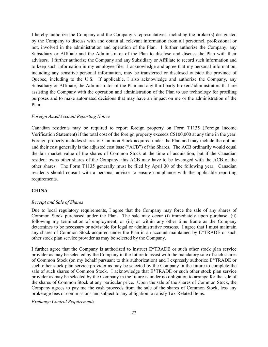 22 I hereby authorize the Company and the Company’s representatives, including the broker(s) designated by the Company to discuss with and obtain all relevant information from all personnel, professional or not, involved in the administration and operation of the Plan. I further authorize the Company, any Subsidiary or Affiliate and the Administrator of the Plan to disclose and discuss the Plan with their advisors. I further authorize the Company and any Subsidiary or Affiliate to record such information and to keep such information in my employee file. I acknowledge and agree that my personal information, including any sensitive personal information, may be transferred or disclosed outside the province of Quebec, including to the U.S. If applicable, I also acknowledge and authorize the Company, any Subsidiary or Affiliate, the Administrator of the Plan and any third party brokers/administrators that are assisting the Company with the operation and administration of the Plan to use technology for profiling purposes and to make automated decisions that may have an impact on me or the administration of the Plan. Foreign Asset/Account Reporting Notice Canadian residents may be required to report foreign property on Form T1135 (Foreign Income Verification Statement) if the total cost of the foreign property exceeds C$100,000 at any time in the year. Foreign property includes shares of Common Stock acquired under the Plan and may include the option, and their cost generally is the adjusted cost base (“ACB”) of the Shares. The ACB ordinarily would equal the fair market value of the shares of Common Stock at the time of acquisition, but if the Canadian resident owns other shares of the Company, this ACB may have to be leveraged with the ACB of the other shares. The Form T1135 generally must be filed by April 30 of the following year. Canadian residents should consult with a personal advisor to ensure compliance with the applicable reporting requirements. CHINA Receipt and Sale of Shares Due to local regulatory requirements, I agree that the Company may force the sale of any shares of Common Stock purchased under the Plan. The sale may occur (i) immediately upon purchase, (ii) following my termination of employment, or (iii) or within any other time frame as the Company determines to be necessary or advisable for legal or administrative reasons. I agree that I must maintain any shares of Common Stock acquired under the Plan in an account maintained by E*TRADE or such other stock plan service provider as may be selected by the Company. I further agree that the Company is authorized to instruct E*TRADE or such other stock plan service provider as may be selected by the Company in the future to assist with the mandatory sale of such shares of Common Stock (on my behalf pursuant to this authorization) and I expressly authorize E*TRADE or such other stock plan service provider as may be selected by the Company in the future to complete the sale of such shares of Common Stock. I acknowledge that E*TRADE or such other stock plan service provider as may be selected by the Company in the future is under no obligation to arrange for the sale of the shares of Common Stock at any particular price. Upon the sale of the shares of Common Stock, the Company agrees to pay me the cash proceeds from the sale of the shares of Common Stock, less any brokerage fees or commissions and subject to any obligation to satisfy Tax-Related Items. Exchange Control Requirements