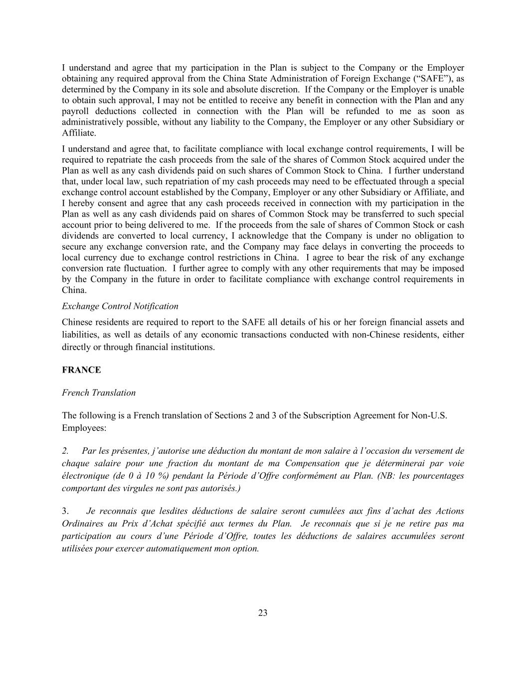 23 I understand and agree that my participation in the Plan is subject to the Company or the Employer obtaining any required approval from the China State Administration of Foreign Exchange (“SAFE”), as determined by the Company in its sole and absolute discretion. If the Company or the Employer is unable to obtain such approval, I may not be entitled to receive any benefit in connection with the Plan and any payroll deductions collected in connection with the Plan will be refunded to me as soon as administratively possible, without any liability to the Company, the Employer or any other Subsidiary or Affiliate. I understand and agree that, to facilitate compliance with local exchange control requirements, I will be required to repatriate the cash proceeds from the sale of the shares of Common Stock acquired under the Plan as well as any cash dividends paid on such shares of Common Stock to China. I further understand that, under local law, such repatriation of my cash proceeds may need to be effectuated through a special exchange control account established by the Company, Employer or any other Subsidiary or Affiliate, and I hereby consent and agree that any cash proceeds received in connection with my participation in the Plan as well as any cash dividends paid on shares of Common Stock may be transferred to such special account prior to being delivered to me. If the proceeds from the sale of shares of Common Stock or cash dividends are converted to local currency, I acknowledge that the Company is under no obligation to secure any exchange conversion rate, and the Company may face delays in converting the proceeds to local currency due to exchange control restrictions in China. I agree to bear the risk of any exchange conversion rate fluctuation. I further agree to comply with any other requirements that may be imposed by the Company in the future in order to facilitate compliance with exchange control requirements in China. Exchange Control Notification Chinese residents are required to report to the SAFE all details of his or her foreign financial assets and liabilities, as well as details of any economic transactions conducted with non-Chinese residents, either directly or through financial institutions. FRANCE French Translation The following is a French translation of Sections 2 and 3 of the Subscription Agreement for Non-U.S. Employees: 2. Par les présentes, j’autorise une déduction du montant de mon salaire à l’occasion du versement de chaque salaire pour une fraction du montant de ma Compensation que je déterminerai par voie électronique (de 0 à 10 %) pendant la Période d’Offre conformément au Plan. (NB: les pourcentages comportant des virgules ne sont pas autorisés.) 3. Je reconnais que lesdites déductions de salaire seront cumulées aux fins d’achat des Actions Ordinaires au Prix d’Achat spécifié aux termes du Plan. Je reconnais que si je ne retire pas ma participation au cours d’une Période d’Offre, toutes les déductions de salaires accumulées seront utilisées pour exercer automatiquement mon option.
