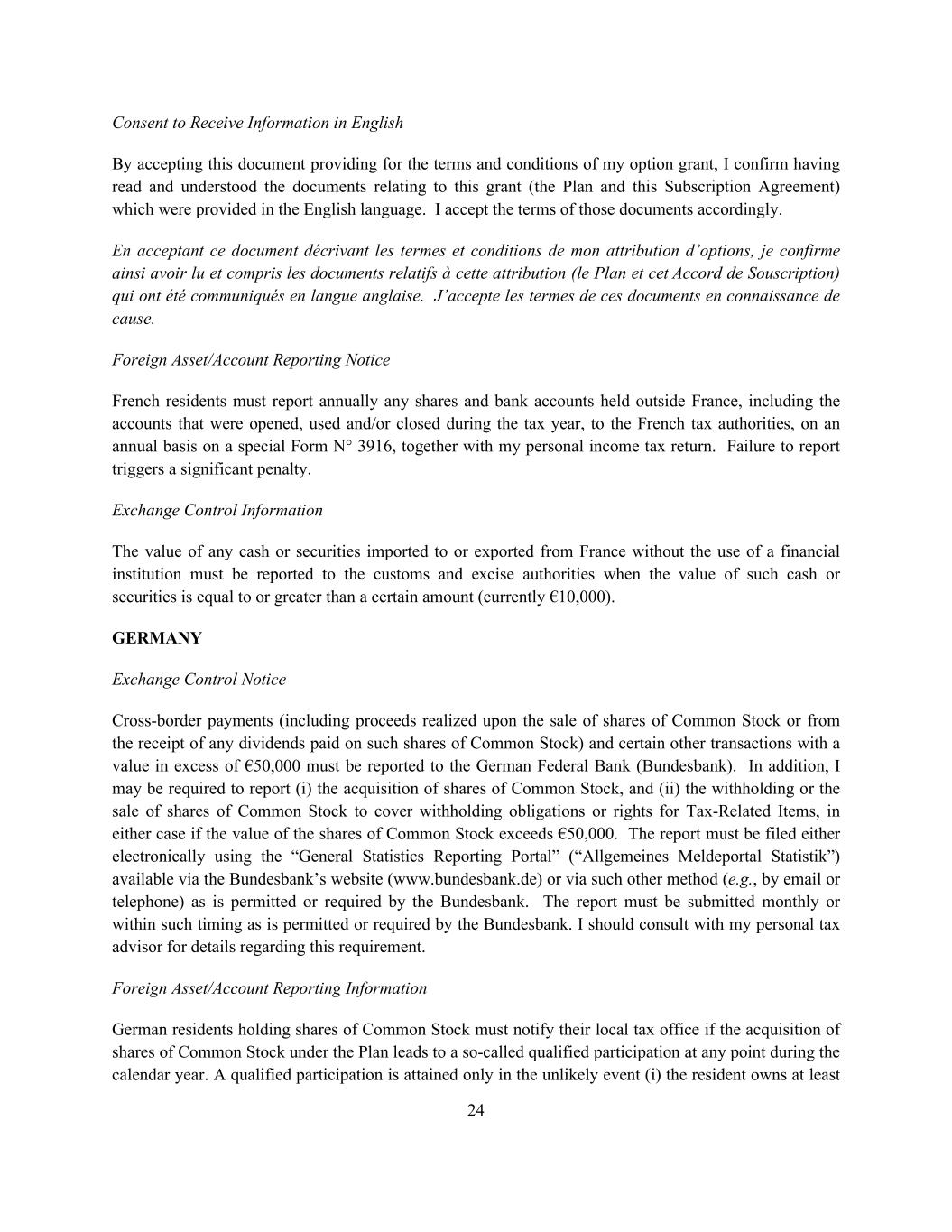 24 Consent to Receive Information in English By accepting this document providing for the terms and conditions of my option grant, I confirm having read and understood the documents relating to this grant (the Plan and this Subscription Agreement) which were provided in the English language. I accept the terms of those documents accordingly. En acceptant ce document décrivant les termes et conditions de mon attribution d’options, je confirme ainsi avoir lu et compris les documents relatifs à cette attribution (le Plan et cet Accord de Souscription) qui ont été communiqués en langue anglaise. J’accepte les termes de ces documents en connaissance de cause. Foreign Asset/Account Reporting Notice French residents must report annually any shares and bank accounts held outside France, including the accounts that were opened, used and/or closed during the tax year, to the French tax authorities, on an annual basis on a special Form N° 3916, together with my personal income tax return. Failure to report triggers a significant penalty. Exchange Control Information The value of any cash or securities imported to or exported from France without the use of a financial institution must be reported to the customs and excise authorities when the value of such cash or securities is equal to or greater than a certain amount (currently €10,000). GERMANY Exchange Control Notice Cross-border payments (including proceeds realized upon the sale of shares of Common Stock or from the receipt of any dividends paid on such shares of Common Stock) and certain other transactions with a value in excess of €50,000 must be reported to the German Federal Bank (Bundesbank). In addition, I may be required to report (i) the acquisition of shares of Common Stock, and (ii) the withholding or the sale of shares of Common Stock to cover withholding obligations or rights for Tax-Related Items, in either case if the value of the shares of Common Stock exceeds €50,000. The report must be filed either electronically using the “General Statistics Reporting Portal” (“Allgemeines Meldeportal Statistik”) available via the Bundesbank’s website (www.bundesbank.de) or via such other method (e.g., by email or telephone) as is permitted or required by the Bundesbank. The report must be submitted monthly or within such timing as is permitted or required by the Bundesbank. I should consult with my personal tax advisor for details regarding this requirement. Foreign Asset/Account Reporting Information German residents holding shares of Common Stock must notify their local tax office if the acquisition of shares of Common Stock under the Plan leads to a so-called qualified participation at any point during the calendar year. A qualified participation is attained only in the unlikely event (i) the resident owns at least