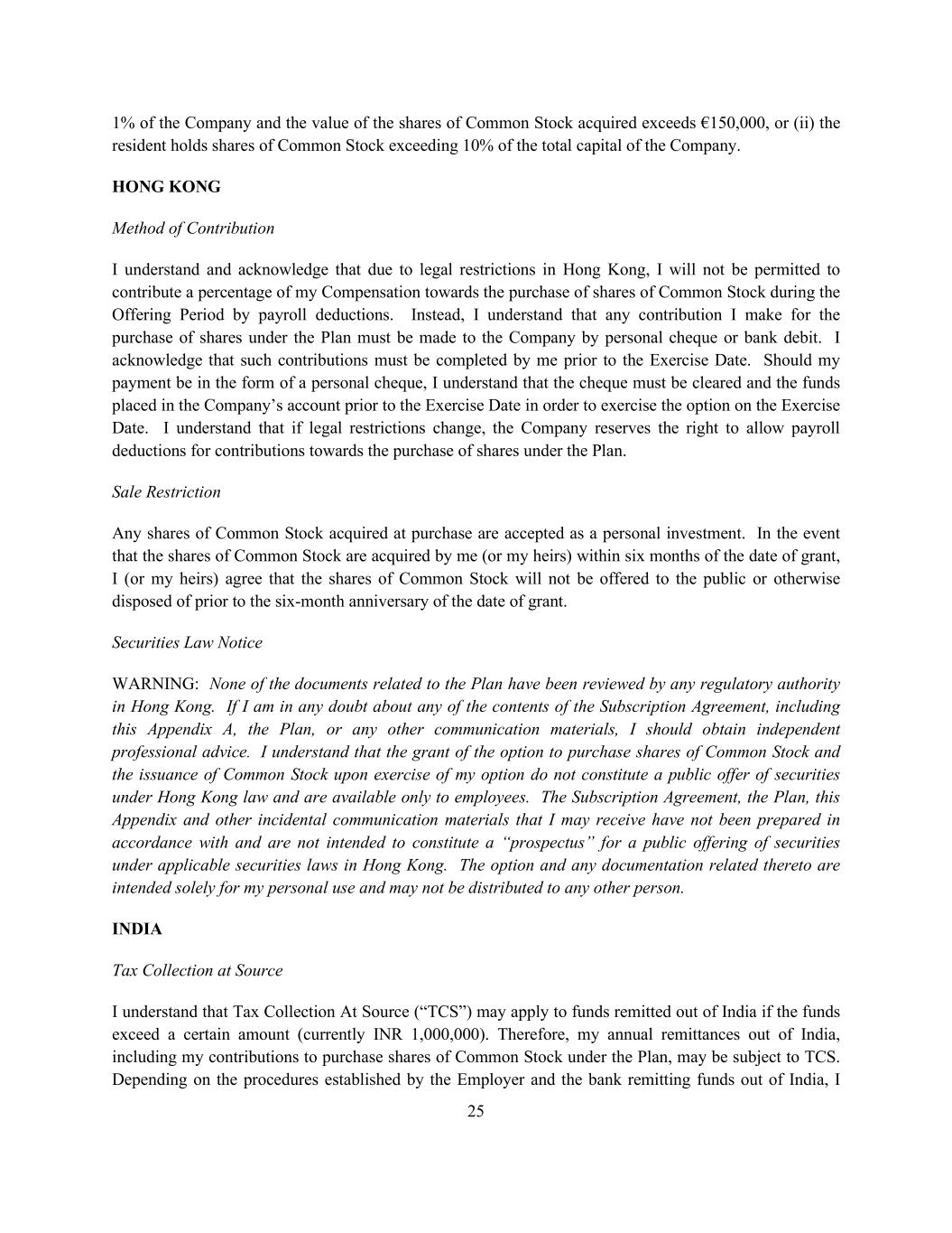 25 1% of the Company and the value of the shares of Common Stock acquired exceeds €150,000, or (ii) the resident holds shares of Common Stock exceeding 10% of the total capital of the Company. HONG KONG Method of Contribution I understand and acknowledge that due to legal restrictions in Hong Kong, I will not be permitted to contribute a percentage of my Compensation towards the purchase of shares of Common Stock during the Offering Period by payroll deductions. Instead, I understand that any contribution I make for the purchase of shares under the Plan must be made to the Company by personal cheque or bank debit. I acknowledge that such contributions must be completed by me prior to the Exercise Date. Should my payment be in the form of a personal cheque, I understand that the cheque must be cleared and the funds placed in the Company’s account prior to the Exercise Date in order to exercise the option on the Exercise Date. I understand that if legal restrictions change, the Company reserves the right to allow payroll deductions for contributions towards the purchase of shares under the Plan. Sale Restriction Any shares of Common Stock acquired at purchase are accepted as a personal investment. In the event that the shares of Common Stock are acquired by me (or my heirs) within six months of the date of grant, I (or my heirs) agree that the shares of Common Stock will not be offered to the public or otherwise disposed of prior to the six-month anniversary of the date of grant. Securities Law Notice WARNING: None of the documents related to the Plan have been reviewed by any regulatory authority in Hong Kong. If I am in any doubt about any of the contents of the Subscription Agreement, including this Appendix A, the Plan, or any other communication materials, I should obtain independent professional advice. I understand that the grant of the option to purchase shares of Common Stock and the issuance of Common Stock upon exercise of my option do not constitute a public offer of securities under Hong Kong law and are available only to employees. The Subscription Agreement, the Plan, this Appendix and other incidental communication materials that I may receive have not been prepared in accordance with and are not intended to constitute a “prospectus” for a public offering of securities under applicable securities laws in Hong Kong. The option and any documentation related thereto are intended solely for my personal use and may not be distributed to any other person. INDIA Tax Collection at Source I understand that Tax Collection At Source (“TCS”) may apply to funds remitted out of India if the funds exceed a certain amount (currently INR 1,000,000). Therefore, my annual remittances out of India, including my contributions to purchase shares of Common Stock under the Plan, may be subject to TCS. Depending on the procedures established by the Employer and the bank remitting funds out of India, I