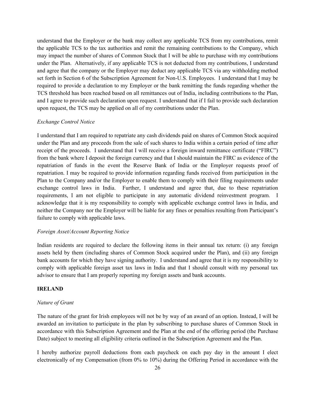 26 understand that the Employer or the bank may collect any applicable TCS from my contributions, remit the applicable TCS to the tax authorities and remit the remaining contributions to the Company, which may impact the number of shares of Common Stock that I will be able to purchase with my contributions under the Plan. Alternatively, if any applicable TCS is not deducted from my contributions, I understand and agree that the company or the Employer may deduct any applicable TCS via any withholding method set forth in Section 6 of the Subscription Agreement for Non-U.S. Employees. I understand that I may be required to provide a declaration to my Employer or the bank remitting the funds regarding whether the TCS threshold has been reached based on all remittances out of India, including contributions to the Plan, and I agree to provide such declaration upon request. I understand that if I fail to provide such declaration upon request, the TCS may be applied on all of my contributions under the Plan. Exchange Control Notice I understand that I am required to repatriate any cash dividends paid on shares of Common Stock acquired under the Plan and any proceeds from the sale of such shares to India within a certain period of time after receipt of the proceeds. I understand that I will receive a foreign inward remittance certificate (“FIRC”) from the bank where I deposit the foreign currency and that I should maintain the FIRC as evidence of the repatriation of funds in the event the Reserve Bank of India or the Employer requests proof of repatriation. I may be required to provide information regarding funds received from participation in the Plan to the Company and/or the Employer to enable them to comply with their filing requirements under exchange control laws in India. Further, I understand and agree that, due to these repatriation requirements, I am not eligible to participate in any automatic dividend reinvestment program. I acknowledge that it is my responsibility to comply with applicable exchange control laws in India, and neither the Company nor the Employer will be liable for any fines or penalties resulting from Participant’s failure to comply with applicable laws. Foreign Asset/Account Reporting Notice Indian residents are required to declare the following items in their annual tax return: (i) any foreign assets held by them (including shares of Common Stock acquired under the Plan), and (ii) any foreign bank accounts for which they have signing authority. I understand and agree that it is my responsibility to comply with applicable foreign asset tax laws in India and that I should consult with my personal tax advisor to ensure that I am properly reporting my foreign assets and bank accounts. IRELAND Nature of Grant The nature of the grant for Irish employees will not be by way of an award of an option. Instead, I will be awarded an invitation to participate in the plan by subscribing to purchase shares of Common Stock in accordance with this Subscription Agreement and the Plan at the end of the offering period (the Purchase Date) subject to meeting all eligibility criteria outlined in the Subscription Agreement and the Plan. I hereby authorize payroll deductions from each paycheck on each pay day in the amount I elect electronically of my Compensation (from 0% to 10%) during the Offering Period in accordance with the