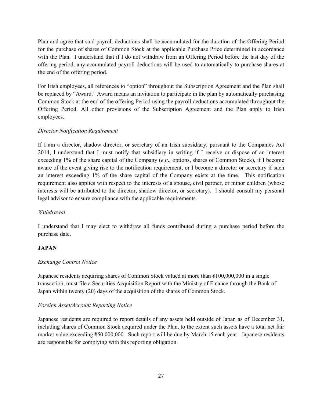 27 Plan and agree that said payroll deductions shall be accumulated for the duration of the Offering Period for the purchase of shares of Common Stock at the applicable Purchase Price determined in accordance with the Plan. I understand that if I do not withdraw from an Offering Period before the last day of the offering period, any accumulated payroll deductions will be used to automatically to purchase shares at the end of the offering period. For Irish employees, all references to “option” throughout the Subscription Agreement and the Plan shall be replaced by “Award.” Award means an invitation to participate in the plan by automatically purchasing Common Stock at the end of the offering Period using the payroll deductions accumulated throughout the Offering Period. All other provisions of the Subscription Agreement and the Plan apply to Irish employees. Director Notification Requirement If I am a director, shadow director, or secretary of an Irish subsidiary, pursuant to the Companies Act 2014, I understand that I must notify that subsidiary in writing if I receive or dispose of an interest exceeding 1% of the share capital of the Company (e.g., options, shares of Common Stock), if I become aware of the event giving rise to the notification requirement, or I become a director or secretary if such an interest exceeding 1% of the share capital of the Company exists at the time. This notification requirement also applies with respect to the interests of a spouse, civil partner, or minor children (whose interests will be attributed to the director, shadow director, or secretary). I should consult my personal legal advisor to ensure compliance with the applicable requirements. Withdrawal I understand that I may elect to withdraw all funds contributed during a purchase period before the purchase date. JAPAN Exchange Control Notice Japanese residents acquiring shares of Common Stock valued at more than ¥100,000,000 in a single transaction, must file a Securities Acquisition Report with the Ministry of Finance through the Bank of Japan within twenty (20) days of the acquisition of the shares of Common Stock. Foreign Asset/Account Reporting Notice Japanese residents are required to report details of any assets held outside of Japan as of December 31, including shares of Common Stock acquired under the Plan, to the extent such assets have a total net fair market value exceeding ¥50,000,000. Such report will be due by March 15 each year. Japanese residents are responsible for complying with this reporting obligation.