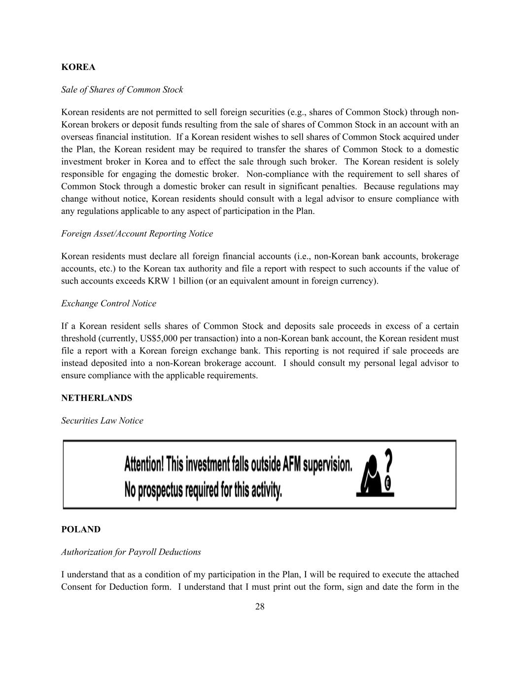 28 KOREA Sale of Shares of Common Stock Korean residents are not permitted to sell foreign securities (e.g., shares of Common Stock) through non- Korean brokers or deposit funds resulting from the sale of shares of Common Stock in an account with an overseas financial institution. If a Korean resident wishes to sell shares of Common Stock acquired under the Plan, the Korean resident may be required to transfer the shares of Common Stock to a domestic investment broker in Korea and to effect the sale through such broker. The Korean resident is solely responsible for engaging the domestic broker. Non-compliance with the requirement to sell shares of Common Stock through a domestic broker can result in significant penalties. Because regulations may change without notice, Korean residents should consult with a legal advisor to ensure compliance with any regulations applicable to any aspect of participation in the Plan. Foreign Asset/Account Reporting Notice Korean residents must declare all foreign financial accounts (i.e., non-Korean bank accounts, brokerage accounts, etc.) to the Korean tax authority and file a report with respect to such accounts if the value of such accounts exceeds KRW 1 billion (or an equivalent amount in foreign currency). Exchange Control Notice If a Korean resident sells shares of Common Stock and deposits sale proceeds in excess of a certain threshold (currently, US$5,000 per transaction) into a non-Korean bank account, the Korean resident must file a report with a Korean foreign exchange bank. This reporting is not required if sale proceeds are instead deposited into a non-Korean brokerage account. I should consult my personal legal advisor to ensure compliance with the applicable requirements. NETHERLANDS Securities Law Notice POLAND Authorization for Payroll Deductions I understand that as a condition of my participation in the Plan, I will be required to execute the attached Consent for Deduction form. I understand that I must print out the form, sign and date the form in the