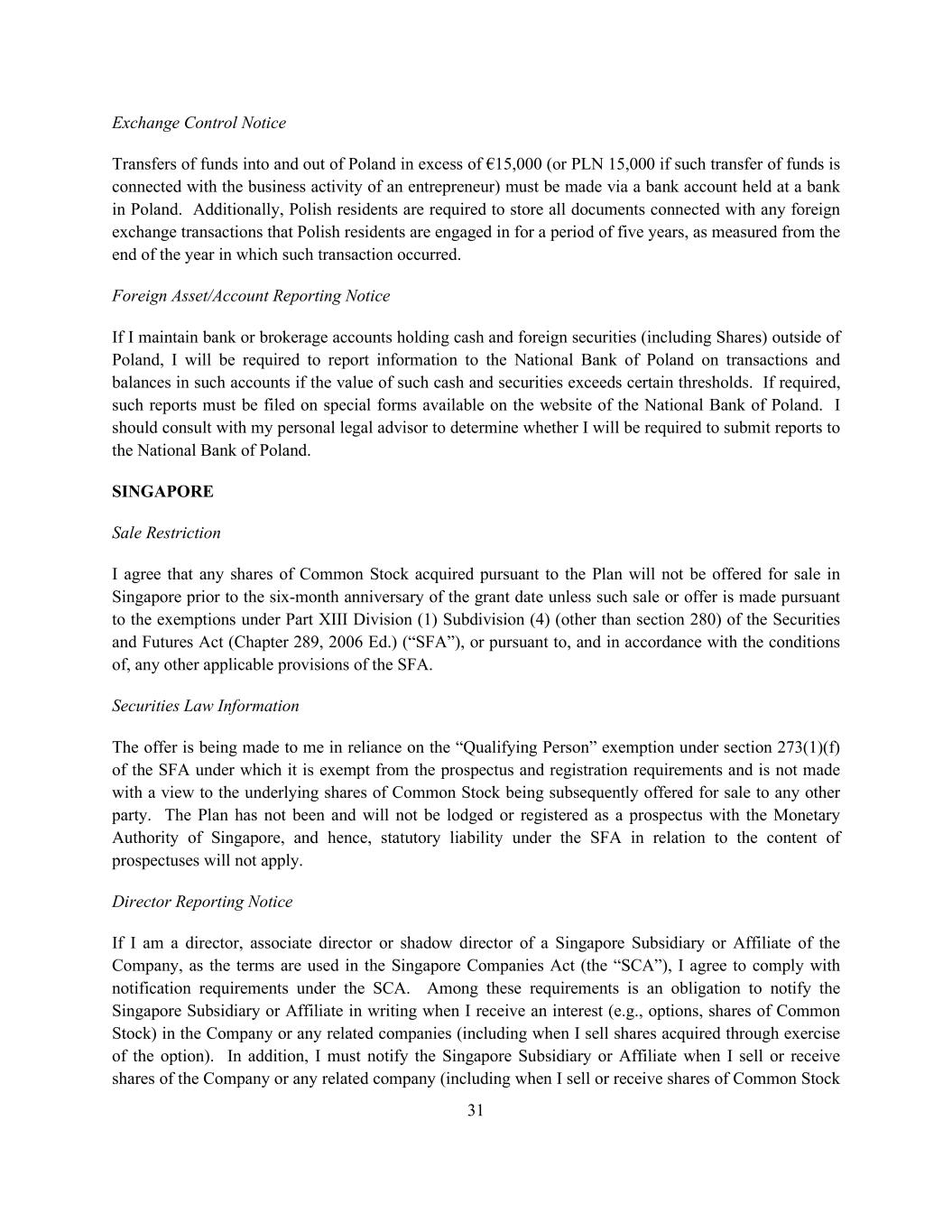 31 Exchange Control Notice Transfers of funds into and out of Poland in excess of €15,000 (or PLN 15,000 if such transfer of funds is connected with the business activity of an entrepreneur) must be made via a bank account held at a bank in Poland. Additionally, Polish residents are required to store all documents connected with any foreign exchange transactions that Polish residents are engaged in for a period of five years, as measured from the end of the year in which such transaction occurred. Foreign Asset/Account Reporting Notice If I maintain bank or brokerage accounts holding cash and foreign securities (including Shares) outside of Poland, I will be required to report information to the National Bank of Poland on transactions and balances in such accounts if the value of such cash and securities exceeds certain thresholds. If required, such reports must be filed on special forms available on the website of the National Bank of Poland. I should consult with my personal legal advisor to determine whether I will be required to submit reports to the National Bank of Poland. SINGAPORE Sale Restriction I agree that any shares of Common Stock acquired pursuant to the Plan will not be offered for sale in Singapore prior to the six-month anniversary of the grant date unless such sale or offer is made pursuant to the exemptions under Part XIII Division (1) Subdivision (4) (other than section 280) of the Securities and Futures Act (Chapter 289, 2006 Ed.) (“SFA”), or pursuant to, and in accordance with the conditions of, any other applicable provisions of the SFA. Securities Law Information The offer is being made to me in reliance on the “Qualifying Person” exemption under section 273(1)(f) of the SFA under which it is exempt from the prospectus and registration requirements and is not made with a view to the underlying shares of Common Stock being subsequently offered for sale to any other party. The Plan has not been and will not be lodged or registered as a prospectus with the Monetary Authority of Singapore, and hence, statutory liability under the SFA in relation to the content of prospectuses will not apply. Director Reporting Notice If I am a director, associate director or shadow director of a Singapore Subsidiary or Affiliate of the Company, as the terms are used in the Singapore Companies Act (the “SCA”), I agree to comply with notification requirements under the SCA. Among these requirements is an obligation to notify the Singapore Subsidiary or Affiliate in writing when I receive an interest (e.g., options, shares of Common Stock) in the Company or any related companies (including when I sell shares acquired through exercise of the option). In addition, I must notify the Singapore Subsidiary or Affiliate when I sell or receive shares of the Company or any related company (including when I sell or receive shares of Common Stock