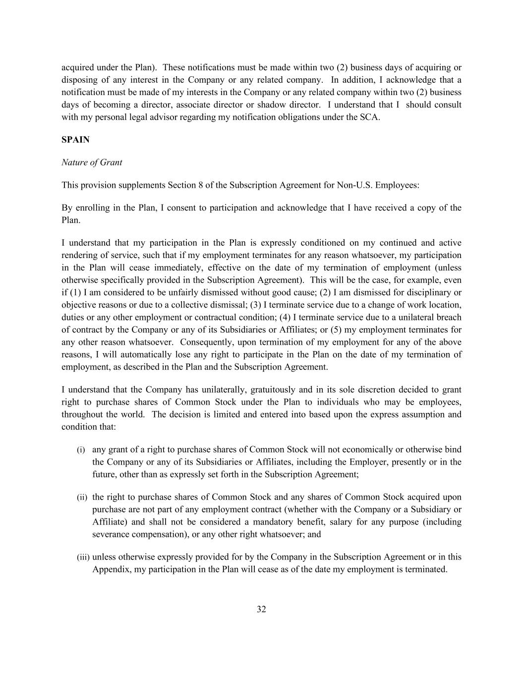 32 acquired under the Plan). These notifications must be made within two (2) business days of acquiring or disposing of any interest in the Company or any related company. In addition, I acknowledge that a notification must be made of my interests in the Company or any related company within two (2) business days of becoming a director, associate director or shadow director. I understand that I should consult with my personal legal advisor regarding my notification obligations under the SCA. SPAIN Nature of Grant This provision supplements Section 8 of the Subscription Agreement for Non-U.S. Employees: By enrolling in the Plan, I consent to participation and acknowledge that I have received a copy of the Plan. I understand that my participation in the Plan is expressly conditioned on my continued and active rendering of service, such that if my employment terminates for any reason whatsoever, my participation in the Plan will cease immediately, effective on the date of my termination of employment (unless otherwise specifically provided in the Subscription Agreement). This will be the case, for example, even if (1) I am considered to be unfairly dismissed without good cause; (2) I am dismissed for disciplinary or objective reasons or due to a collective dismissal; (3) I terminate service due to a change of work location, duties or any other employment or contractual condition; (4) I terminate service due to a unilateral breach of contract by the Company or any of its Subsidiaries or Affiliates; or (5) my employment terminates for any other reason whatsoever. Consequently, upon termination of my employment for any of the above reasons, I will automatically lose any right to participate in the Plan on the date of my termination of employment, as described in the Plan and the Subscription Agreement. I understand that the Company has unilaterally, gratuitously and in its sole discretion decided to grant right to purchase shares of Common Stock under the Plan to individuals who may be employees, throughout the world. The decision is limited and entered into based upon the express assumption and condition that: (i) any grant of a right to purchase shares of Common Stock will not economically or otherwise bind the Company or any of its Subsidiaries or Affiliates, including the Employer, presently or in the future, other than as expressly set forth in the Subscription Agreement; (ii) the right to purchase shares of Common Stock and any shares of Common Stock acquired upon purchase are not part of any employment contract (whether with the Company or a Subsidiary or Affiliate) and shall not be considered a mandatory benefit, salary for any purpose (including severance compensation), or any other right whatsoever; and (iii) unless otherwise expressly provided for by the Company in the Subscription Agreement or in this Appendix, my participation in the Plan will cease as of the date my employment is terminated.