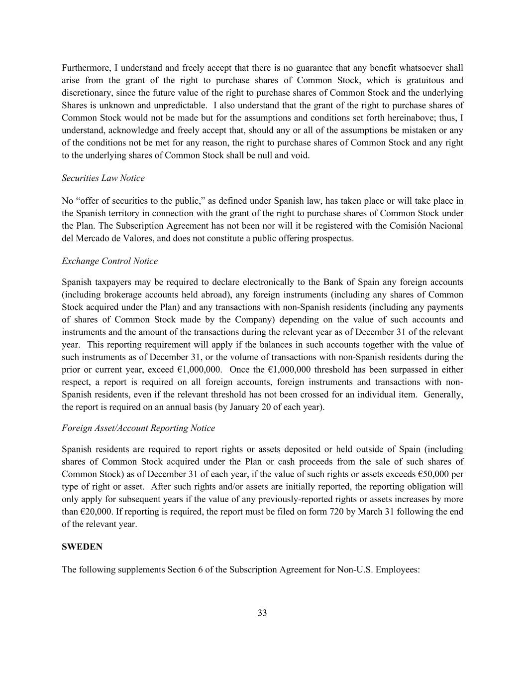 33 Furthermore, I understand and freely accept that there is no guarantee that any benefit whatsoever shall arise from the grant of the right to purchase shares of Common Stock, which is gratuitous and discretionary, since the future value of the right to purchase shares of Common Stock and the underlying Shares is unknown and unpredictable. I also understand that the grant of the right to purchase shares of Common Stock would not be made but for the assumptions and conditions set forth hereinabove; thus, I understand, acknowledge and freely accept that, should any or all of the assumptions be mistaken or any of the conditions not be met for any reason, the right to purchase shares of Common Stock and any right to the underlying shares of Common Stock shall be null and void. Securities Law Notice No “offer of securities to the public,” as defined under Spanish law, has taken place or will take place in the Spanish territory in connection with the grant of the right to purchase shares of Common Stock under the Plan. The Subscription Agreement has not been nor will it be registered with the Comisión Nacional del Mercado de Valores, and does not constitute a public offering prospectus. Exchange Control Notice Spanish taxpayers may be required to declare electronically to the Bank of Spain any foreign accounts (including brokerage accounts held abroad), any foreign instruments (including any shares of Common Stock acquired under the Plan) and any transactions with non-Spanish residents (including any payments of shares of Common Stock made by the Company) depending on the value of such accounts and instruments and the amount of the transactions during the relevant year as of December 31 of the relevant year. This reporting requirement will apply if the balances in such accounts together with the value of such instruments as of December 31, or the volume of transactions with non-Spanish residents during the prior or current year, exceed €1,000,000. Once the €1,000,000 threshold has been surpassed in either respect, a report is required on all foreign accounts, foreign instruments and transactions with non- Spanish residents, even if the relevant threshold has not been crossed for an individual item. Generally, the report is required on an annual basis (by January 20 of each year). Foreign Asset/Account Reporting Notice Spanish residents are required to report rights or assets deposited or held outside of Spain (including shares of Common Stock acquired under the Plan or cash proceeds from the sale of such shares of Common Stock) as of December 31 of each year, if the value of such rights or assets exceeds €50,000 per type of right or asset. After such rights and/or assets are initially reported, the reporting obligation will only apply for subsequent years if the value of any previously-reported rights or assets increases by more than €20,000. If reporting is required, the report must be filed on form 720 by March 31 following the end of the relevant year. SWEDEN The following supplements Section 6 of the Subscription Agreement for Non-U.S. Employees: