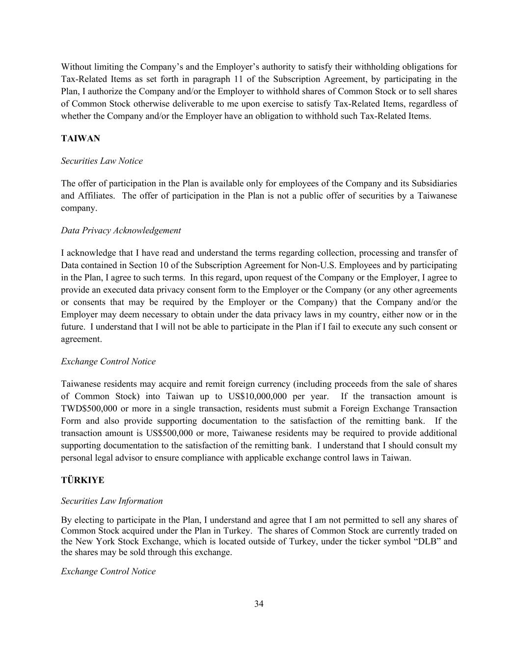 34 Without limiting the Company’s and the Employer’s authority to satisfy their withholding obligations for Tax-Related Items as set forth in paragraph 11 of the Subscription Agreement, by participating in the Plan, I authorize the Company and/or the Employer to withhold shares of Common Stock or to sell shares of Common Stock otherwise deliverable to me upon exercise to satisfy Tax-Related Items, regardless of whether the Company and/or the Employer have an obligation to withhold such Tax-Related Items. TAIWAN Securities Law Notice The offer of participation in the Plan is available only for employees of the Company and its Subsidiaries and Affiliates. The offer of participation in the Plan is not a public offer of securities by a Taiwanese company. Data Privacy Acknowledgement I acknowledge that I have read and understand the terms regarding collection, processing and transfer of Data contained in Section 10 of the Subscription Agreement for Non-U.S. Employees and by participating in the Plan, I agree to such terms. In this regard, upon request of the Company or the Employer, I agree to provide an executed data privacy consent form to the Employer or the Company (or any other agreements or consents that may be required by the Employer or the Company) that the Company and/or the Employer may deem necessary to obtain under the data privacy laws in my country, either now or in the future. I understand that I will not be able to participate in the Plan if I fail to execute any such consent or agreement. Exchange Control Notice Taiwanese residents may acquire and remit foreign currency (including proceeds from the sale of shares of Common Stock) into Taiwan up to US$10,000,000 per year. If the transaction amount is TWD$500,000 or more in a single transaction, residents must submit a Foreign Exchange Transaction Form and also provide supporting documentation to the satisfaction of the remitting bank. If the transaction amount is US$500,000 or more, Taiwanese residents may be required to provide additional supporting documentation to the satisfaction of the remitting bank. I understand that I should consult my personal legal advisor to ensure compliance with applicable exchange control laws in Taiwan. TÜRKIYE Securities Law Information By electing to participate in the Plan, I understand and agree that I am not permitted to sell any shares of Common Stock acquired under the Plan in Turkey. The shares of Common Stock are currently traded on the New York Stock Exchange, which is located outside of Turkey, under the ticker symbol “DLB” and the shares may be sold through this exchange. Exchange Control Notice
