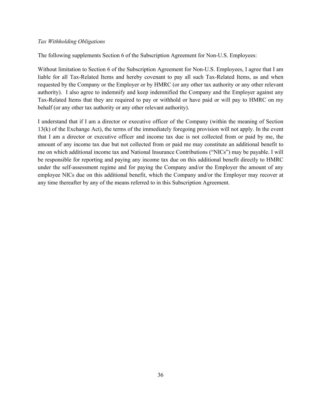 36 Tax Withholding Obligations The following supplements Section 6 of the Subscription Agreement for Non-U.S. Employees: Without limitation to Section 6 of the Subscription Agreement for Non-U.S. Employees, I agree that I am liable for all Tax-Related Items and hereby covenant to pay all such Tax-Related Items, as and when requested by the Company or the Employer or by HMRC (or any other tax authority or any other relevant authority). I also agree to indemnify and keep indemnified the Company and the Employer against any Tax-Related Items that they are required to pay or withhold or have paid or will pay to HMRC on my behalf (or any other tax authority or any other relevant authority). I understand that if I am a director or executive officer of the Company (within the meaning of Section 13(k) of the Exchange Act), the terms of the immediately foregoing provision will not apply. In the event that I am a director or executive officer and income tax due is not collected from or paid by me, the amount of any income tax due but not collected from or paid me may constitute an additional benefit to me on which additional income tax and National Insurance Contributions (“NICs”) may be payable. I will be responsible for reporting and paying any income tax due on this additional benefit directly to HMRC under the self-assessment regime and for paying the Company and/or the Employer the amount of any employee NICs due on this additional benefit, which the Company and/or the Employer may recover at any time thereafter by any of the means referred to in this Subscription Agreement.