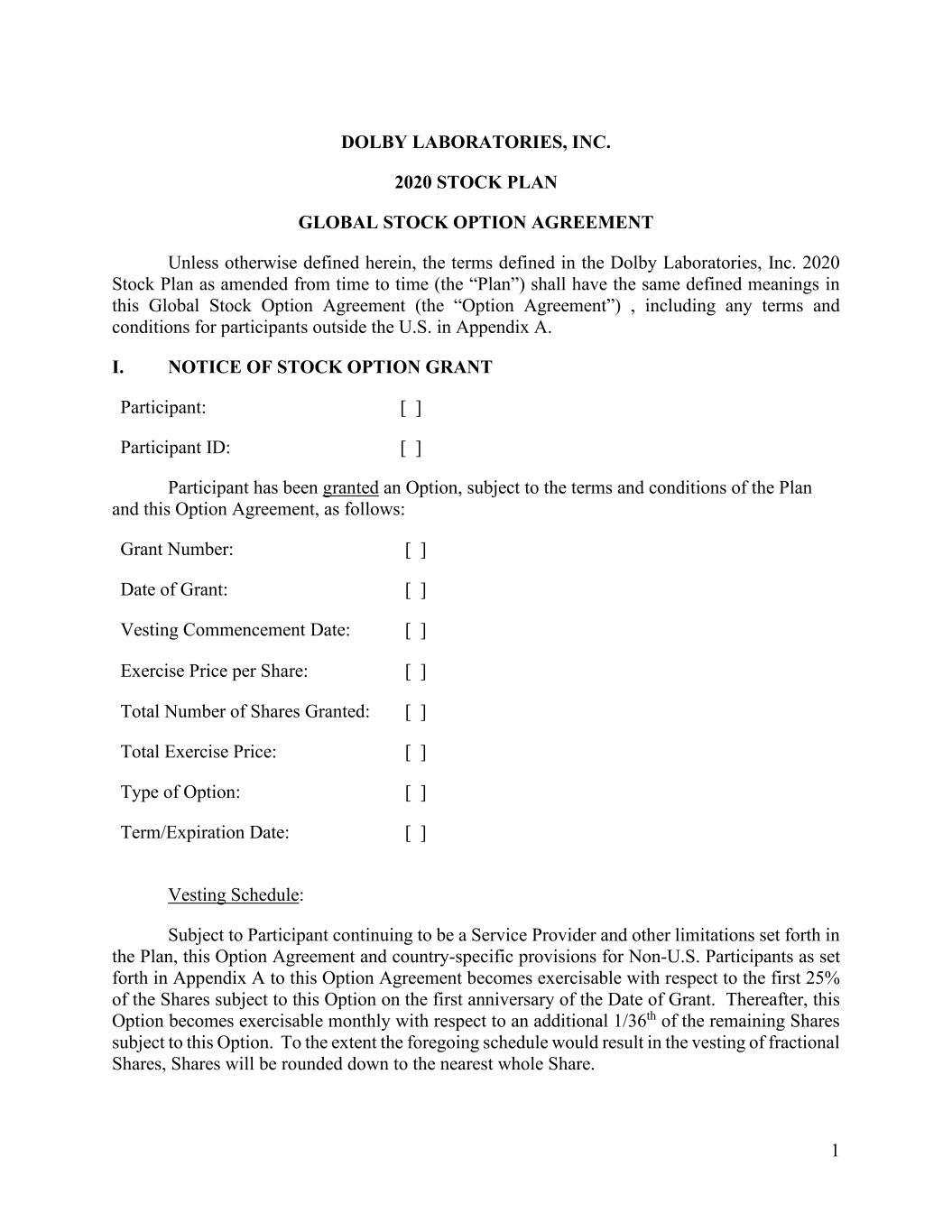 1 DOLBY LABORATORIES, INC. 2020 STOCK PLAN GLOBAL STOCK OPTION AGREEMENT Unless otherwise defined herein, the terms defined in the Dolby Laboratories, Inc. 2020 Stock Plan as amended from time to time (the “Plan”) shall have the same defined meanings in this Global Stock Option Agreement (the “Option Agreement”) , including any terms and conditions for participants outside the U.S. in Appendix A. I. NOTICE OF STOCK OPTION GRANT Participant: [ ] Participant ID: [ ] Participant has been granted an Option, subject to the terms and conditions of the Plan and this Option Agreement, as follows: Grant Number: [ ] Date of Grant: [ ] Vesting Commencement Date: [ ] Exercise Price per Share: [ ] Total Number of Shares Granted: [ ] Total Exercise Price: [ ] Type of Option: [ ] Term/Expiration Date: [ ] Vesting Schedule: Subject to Participant continuing to be a Service Provider and other limitations set forth in the Plan, this Option Agreement and country-specific provisions for Non-U.S. Participants as set forth in Appendix A to this Option Agreement becomes exercisable with respect to the first 25% of the Shares subject to this Option on the first anniversary of the Date of Grant. Thereafter, this Option becomes exercisable monthly with respect to an additional 1/36th of the remaining Shares subject to this Option. To the extent the foregoing schedule would result in the vesting of fractional Shares, Shares will be rounded down to the nearest whole Share.