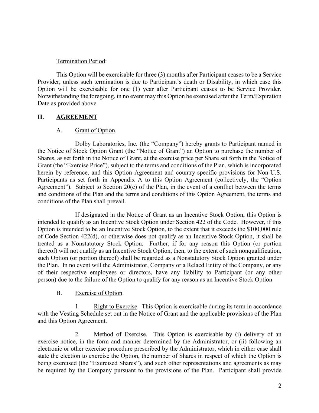 2 Termination Period: This Option will be exercisable for three (3) months after Participant ceases to be a Service Provider, unless such termination is due to Participant’s death or Disability, in which case this Option will be exercisable for one (1) year after Participant ceases to be Service Provider. Notwithstanding the foregoing, in no event may this Option be exercised after the Term/Expiration Date as provided above. II. AGREEMENT A. Grant of Option. Dolby Laboratories, Inc. (the “Company”) hereby grants to Participant named in the Notice of Stock Option Grant (the “Notice of Grant”) an Option to purchase the number of Shares, as set forth in the Notice of Grant, at the exercise price per Share set forth in the Notice of Grant (the “Exercise Price”), subject to the terms and conditions of the Plan, which is incorporated herein by reference, and this Option Agreement and country-specific provisions for Non-U.S. Participants as set forth in Appendix A to this Option Agreement (collectively, the “Option Agreement”). Subject to Section 20(c) of the Plan, in the event of a conflict between the terms and conditions of the Plan and the terms and conditions of this Option Agreement, the terms and conditions of the Plan shall prevail. If designated in the Notice of Grant as an Incentive Stock Option, this Option is intended to qualify as an Incentive Stock Option under Section 422 of the Code. However, if this Option is intended to be an Incentive Stock Option, to the extent that it exceeds the $100,000 rule of Code Section 422(d), or otherwise does not qualify as an Incentive Stock Option, it shall be treated as a Nonstatutory Stock Option. Further, if for any reason this Option (or portion thereof) will not qualify as an Incentive Stock Option, then, to the extent of such nonqualification, such Option (or portion thereof) shall be regarded as a Nonstatutory Stock Option granted under the Plan. In no event will the Administrator, Company or a Relaed Entity of the Company, or any of their respective employees or directors, have any liability to Participant (or any other person) due to the failure of the Option to qualify for any reason as an Incentive Stock Option. B. Exercise of Option. 1. Right to Exercise. This Option is exercisable during its term in accordance with the Vesting Schedule set out in the Notice of Grant and the applicable provisions of the Plan and this Option Agreement. 2. Method of Exercise. This Option is exercisable by (i) delivery of an exercise notice, in the form and manner determined by the Administrator, or (ii) following an electronic or other exercise procedure prescribed by the Administrator, which in either case shall state the election to exercise the Option, the number of Shares in respect of which the Option is being exercised (the “Exercised Shares”), and such other representations and agreements as may be required by the Company pursuant to the provisions of the Plan. Participant shall provide