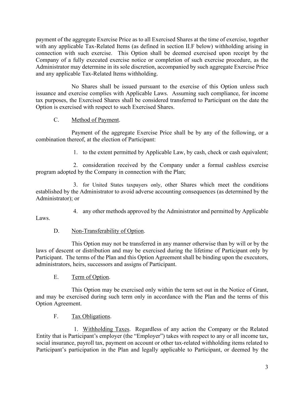 3 payment of the aggregate Exercise Price as to all Exercised Shares at the time of exercise, together with any applicable Tax-Related Items (as defined in section II.F below) withholding arising in connection with such exercise. This Option shall be deemed exercised upon receipt by the Company of a fully executed exercise notice or completion of such exercise procedure, as the Administrator may determine in its sole discretion, accompanied by such aggregate Exercise Price and any applicable Tax-Related Items withholding. No Shares shall be issued pursuant to the exercise of this Option unless such issuance and exercise complies with Applicable Laws. Assuming such compliance, for income tax purposes, the Exercised Shares shall be considered transferred to Participant on the date the Option is exercised with respect to such Exercised Shares. C. Method of Payment. Payment of the aggregate Exercise Price shall be by any of the following, or a combination thereof, at the election of Participant: 1. to the extent permitted by Applicable Law, by cash, check or cash equivalent; 2. consideration received by the Company under a formal cashless exercise program adopted by the Company in connection with the Plan; 3. for United States taxpayers only, other Shares which meet the conditions established by the Administrator to avoid adverse accounting consequences (as determined by the Administrator); or 4. any other methods approved by the Administrator and permitted by Applicable Laws. D. Non-Transferability of Option. This Option may not be transferred in any manner otherwise than by will or by the laws of descent or distribution and may be exercised during the lifetime of Participant only by Participant. The terms of the Plan and this Option Agreement shall be binding upon the executors, administrators, heirs, successors and assigns of Participant. E. Term of Option. This Option may be exercised only within the term set out in the Notice of Grant, and may be exercised during such term only in accordance with the Plan and the terms of this Option Agreement. F. Tax Obligations. 1. Withholding Taxes. Regardless of any action the Company or the Related Entity that is Participant’s employer (the “Employer”) takes with respect to any or all income tax, social insurance, payroll tax, payment on account or other tax-related withholding items related to Participant’s participation in the Plan and legally applicable to Participant, or deemed by the