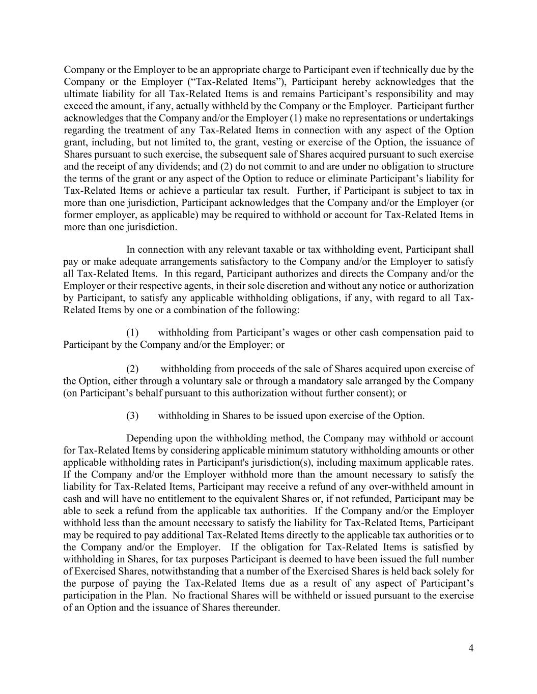 4 Company or the Employer to be an appropriate charge to Participant even if technically due by the Company or the Employer (“Tax-Related Items”), Participant hereby acknowledges that the ultimate liability for all Tax-Related Items is and remains Participant’s responsibility and may exceed the amount, if any, actually withheld by the Company or the Employer. Participant further acknowledges that the Company and/or the Employer (1) make no representations or undertakings regarding the treatment of any Tax-Related Items in connection with any aspect of the Option grant, including, but not limited to, the grant, vesting or exercise of the Option, the issuance of Shares pursuant to such exercise, the subsequent sale of Shares acquired pursuant to such exercise and the receipt of any dividends; and (2) do not commit to and are under no obligation to structure the terms of the grant or any aspect of the Option to reduce or eliminate Participant’s liability for Tax-Related Items or achieve a particular tax result. Further, if Participant is subject to tax in more than one jurisdiction, Participant acknowledges that the Company and/or the Employer (or former employer, as applicable) may be required to withhold or account for Tax-Related Items in more than one jurisdiction. In connection with any relevant taxable or tax withholding event, Participant shall pay or make adequate arrangements satisfactory to the Company and/or the Employer to satisfy all Tax-Related Items. In this regard, Participant authorizes and directs the Company and/or the Employer or their respective agents, in their sole discretion and without any notice or authorization by Participant, to satisfy any applicable withholding obligations, if any, with regard to all Tax- Related Items by one or a combination of the following: (1) withholding from Participant’s wages or other cash compensation paid to Participant by the Company and/or the Employer; or (2) withholding from proceeds of the sale of Shares acquired upon exercise of the Option, either through a voluntary sale or through a mandatory sale arranged by the Company (on Participant’s behalf pursuant to this authorization without further consent); or (3) withholding in Shares to be issued upon exercise of the Option. Depending upon the withholding method, the Company may withhold or account for Tax-Related Items by considering applicable minimum statutory withholding amounts or other applicable withholding rates in Participant's jurisdiction(s), including maximum applicable rates. If the Company and/or the Employer withhold more than the amount necessary to satisfy the liability for Tax-Related Items, Participant may receive a refund of any over-withheld amount in cash and will have no entitlement to the equivalent Shares or, if not refunded, Participant may be able to seek a refund from the applicable tax authorities. If the Company and/or the Employer withhold less than the amount necessary to satisfy the liability for Tax-Related Items, Participant may be required to pay additional Tax-Related Items directly to the applicable tax authorities or to the Company and/or the Employer. If the obligation for Tax-Related Items is satisfied by withholding in Shares, for tax purposes Participant is deemed to have been issued the full number of Exercised Shares, notwithstanding that a number of the Exercised Shares is held back solely for the purpose of paying the Tax-Related Items due as a result of any aspect of Participant’s participation in the Plan. No fractional Shares will be withheld or issued pursuant to the exercise of an Option and the issuance of Shares thereunder.