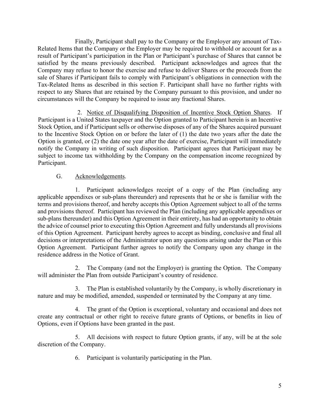 5 Finally, Participant shall pay to the Company or the Employer any amount of Tax- Related Items that the Company or the Employer may be required to withhold or account for as a result of Participant’s participation in the Plan or Participant’s purchase of Shares that cannot be satisfied by the means previously described. Participant acknowledges and agrees that the Company may refuse to honor the exercise and refuse to deliver Shares or the proceeds from the sale of Shares if Participant fails to comply with Participant’s obligations in connection with the Tax-Related Items as described in this section F. Participant shall have no further rights with respect to any Shares that are retained by the Company pursuant to this provision, and under no circumstances will the Company be required to issue any fractional Shares. 2. Notice of Disqualifying Disposition of Incentive Stock Option Shares. If Participant is a United States taxpayer and the Option granted to Participant herein is an Incentive Stock Option, and if Participant sells or otherwise disposes of any of the Shares acquired pursuant to the Incentive Stock Option on or before the later of (1) the date two years after the date the Option is granted, or (2) the date one year after the date of exercise, Participant will immediately notify the Company in writing of such disposition. Participant agrees that Participant may be subject to income tax withholding by the Company on the compensation income recognized by Participant. G. Acknowledgements. 1. Participant acknowledges receipt of a copy of the Plan (including any applicable appendixes or sub-plans thereunder) and represents that he or she is familiar with the terms and provisions thereof, and hereby accepts this Option Agreement subject to all of the terms and provisions thereof. Participant has reviewed the Plan (including any applicable appendixes or sub-plans thereunder) and this Option Agreement in their entirety, has had an opportunity to obtain the advice of counsel prior to executing this Option Agreement and fully understands all provisions of this Option Agreement. Participant hereby agrees to accept as binding, conclusive and final all decisions or interpretations of the Administrator upon any questions arising under the Plan or this Option Agreement. Participant further agrees to notify the Company upon any change in the residence address in the Notice of Grant. 2. The Company (and not the Employer) is granting the Option. The Company will administer the Plan from outside Participant’s country of residence. 3. The Plan is established voluntarily by the Company, is wholly discretionary in nature and may be modified, amended, suspended or terminated by the Company at any time. 4. The grant of the Option is exceptional, voluntary and occasional and does not create any contractual or other right to receive future grants of Options, or benefits in lieu of Options, even if Options have been granted in the past. 5. All decisions with respect to future Option grants, if any, will be at the sole discretion of the Company. 6. Participant is voluntarily participating in the Plan.