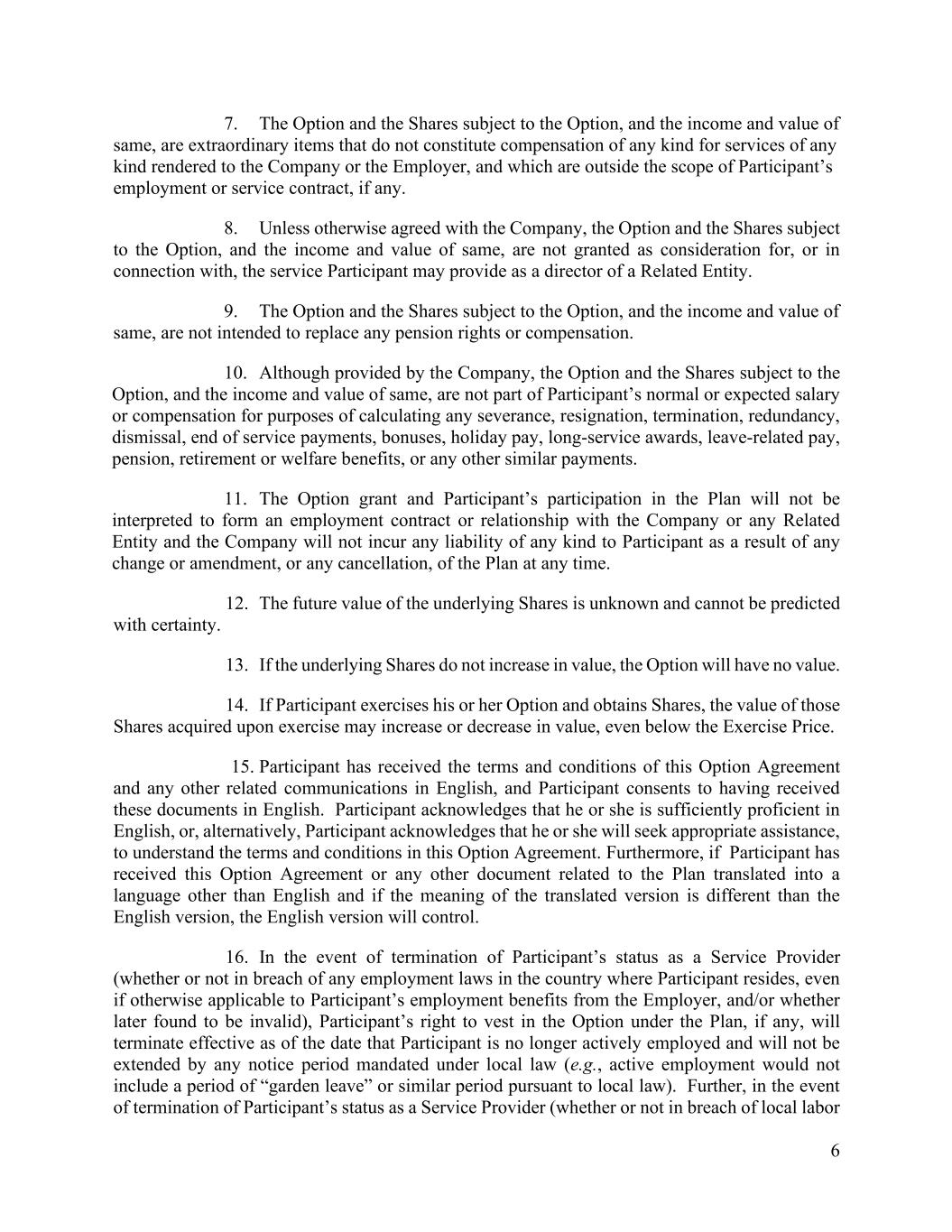 6 7. The Option and the Shares subject to the Option, and the income and value of same, are extraordinary items that do not constitute compensation of any kind for services of any kind rendered to the Company or the Employer, and which are outside the scope of Participant’s employment or service contract, if any. 8. Unless otherwise agreed with the Company, the Option and the Shares subject to the Option, and the income and value of same, are not granted as consideration for, or in connection with, the service Participant may provide as a director of a Related Entity. 9. The Option and the Shares subject to the Option, and the income and value of same, are not intended to replace any pension rights or compensation. 10. Although provided by the Company, the Option and the Shares subject to the Option, and the income and value of same, are not part of Participant’s normal or expected salary or compensation for purposes of calculating any severance, resignation, termination, redundancy, dismissal, end of service payments, bonuses, holiday pay, long-service awards, leave-related pay, pension, retirement or welfare benefits, or any other similar payments. 11. The Option grant and Participant’s participation in the Plan will not be interpreted to form an employment contract or relationship with the Company or any Related Entity and the Company will not incur any liability of any kind to Participant as a result of any change or amendment, or any cancellation, of the Plan at any time. 12. The future value of the underlying Shares is unknown and cannot be predicted with certainty. 13. If the underlying Shares do not increase in value, the Option will have no value. 14. If Participant exercises his or her Option and obtains Shares, the value of those Shares acquired upon exercise may increase or decrease in value, even below the Exercise Price. 15. Participant has received the terms and conditions of this Option Agreement and any other related communications in English, and Participant consents to having received these documents in English. Participant acknowledges that he or she is sufficiently proficient in English, or, alternatively, Participant acknowledges that he or she will seek appropriate assistance, to understand the terms and conditions in this Option Agreement. Furthermore, if Participant has received this Option Agreement or any other document related to the Plan translated into a language other than English and if the meaning of the translated version is different than the English version, the English version will control. 16. In the event of termination of Participant’s status as a Service Provider (whether or not in breach of any employment laws in the country where Participant resides, even if otherwise applicable to Participant’s employment benefits from the Employer, and/or whether later found to be invalid), Participant’s right to vest in the Option under the Plan, if any, will terminate effective as of the date that Participant is no longer actively employed and will not be extended by any notice period mandated under local law (e.g., active employment would not include a period of “garden leave” or similar period pursuant to local law). Further, in the event of termination of Participant’s status as a Service Provider (whether or not in breach of local labor