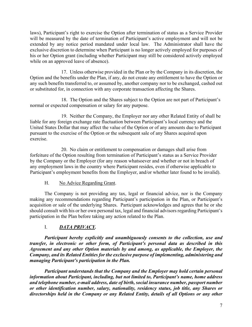 7 laws), Participant’s right to exercise the Option after termination of status as a Service Provider will be measured by the date of termination of Participant’s active employment and will not be extended by any notice period mandated under local law. The Administrator shall have the exclusive discretion to determine when Participant is no longer actively employed for purposes of his or her Option grant (including whether Participant may still be considered actively employed while on an approved leave of absence). 17. Unless otherwise provided in the Plan or by the Company in its discretion, the Option and the benefits under the Plan, if any, do not create any entitlement to have the Option or any such benefits transferred to, or assumed by, another company nor to be exchanged, cashed out or substituted for, in connection with any corporate transaction affecting the Shares. 18. The Option and the Shares subject to the Option are not part of Participant’s normal or expected compensation or salary for any purpose. 19. Neither the Company, the Employer nor any other Related Entity of shall be liable for any foreign exchange rate fluctuation between Participant’s local currency and the United States Dollar that may affect the value of the Option or of any amounts due to Participant pursuant to the exercise of the Option or the subsequent sale of any Shares acquired upon exercise. 20. No claim or entitlement to compensation or damages shall arise from forfeiture of the Option resulting from termination of Participant’s status as a Service Provider by the Company or the Employer (for any reason whatsoever and whether or not in breach of any employment laws in the country where Participant resides, even if otherwise applicable to Participant’s employment benefits from the Employer, and/or whether later found to be invalid). H. No Advice Regarding Grant. The Company is not providing any tax, legal or financial advice, nor is the Company making any recommendations regarding Participant’s participation in the Plan, or Participant’s acquisition or sale of the underlying Shares. Participant acknowledges and agrees that he or she should consult with his or her own personal tax, legal and financial advisors regarding Participant’s participation in the Plan before taking any action related to the Plan. I. DATA PRIVACY. Participant hereby explicitly and unambiguously consents to the collection, use and transfer, in electronic or other form, of Participant’s personal data as described in this Agreement and any other Option materials by and among, as applicable, the Employer, the Company, and its Related Entities for the exclusive purpose of implementing, administering and managing Participant’s participation in the Plan. Participant understands that the Company and the Employer may hold certain personal information about Participant, including, but not limited to, Participant’s name, home address and telephone number, e-mail address, date of birth, social insurance number, passport number or other identification number, salary, nationality, residency status, job title, any Shares or directorships held in the Company or any Related Entity, details of all Options or any other