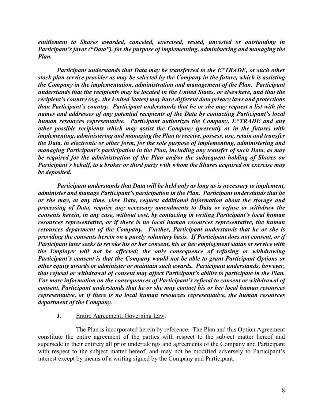 8 entitlement to Shares awarded, canceled, exercised, vested, unvested or outstanding in Participant’s favor (“Data”), for the purpose of implementing, administering and managing the Plan. Participant understands that Data may be transferred to the E*TRADE, or such other stock plan service provider as may be selected by the Company in the future, which is assisting the Company in the implementation, administration and management of the Plan. Participant understands that the recipients may be located in the United States, or elsewhere, and that the recipient’s country (e.g., the United States) may have different data privacy laws and protections than Participant’s country. Participant understands that he or she may request a list with the names and addresses of any potential recipients of the Data by contacting Participant’s local human resources representative. Participant authorizes the Company, E*TRADE and any other possible recipients which may assist the Company (presently or in the future) with implementing, administering and managing the Plan to receive, possess, use, retain and transfer the Data, in electronic or other form, for the sole purpose of implementing, administering and managing Participant’s participation in the Plan, including any transfer of such Data, as may be required for the administration of the Plan and/or the subsequent holding of Shares on Participant’s behalf, to a broker or third party with whom the Shares acquired on exercise may be deposited. Participant understands that Data will be held only as long as is necessary to implement, administer and manage Participant’s participation in the Plan. Participant understands that he or she may, at any time, view Data, request additional information about the storage and processing of Data, require any necessary amendments to Data or refuse or withdraw the consents herein, in any case, without cost, by contacting in writing Participant’s local human resources representative, or if there is no local human resources representative, the human resources department of the Company. Further, Participant understands that he or she is providing the consents herein on a purely voluntary basis. If Participant does not consent, or if Participant later seeks to revoke his or her consent, his or her employment status or service with the Employer will not be affected; the only consequence of refusing or withdrawing Participant’s consent is that the Company would not be able to grant Participant Options or other equity awards or administer or maintain such awards. Participant understands, however, that refusal or withdrawal of consent may affect Participant’s ability to participate in the Plan. For more information on the consequences of Participant’s refusal to consent or withdrawal of consent, Participant understands that he or she may contact his or her local human resources representative, or if there is no local human resources representative, the human resources department of the Company. J. Entire Agreement; Governing Law. The Plan is incorporated herein by reference. The Plan and this Option Agreement constitute the entire agreement of the parties with respect to the subject matter hereof and supersede in their entirety all prior undertakings and agreements of the Company and Participant with respect to the subject matter hereof, and may not be modified adversely to Participant’s interest except by means of a writing signed by the Company and Participant.