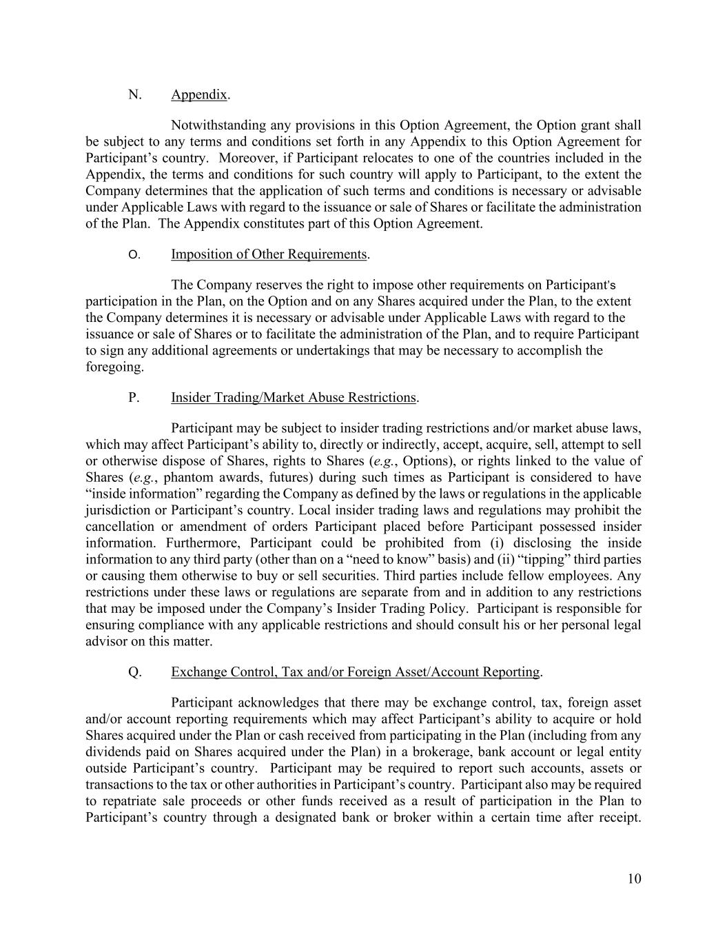 10 N. Appendix. Notwithstanding any provisions in this Option Agreement, the Option grant shall be subject to any terms and conditions set forth in any Appendix to this Option Agreement for Participant’s country. Moreover, if Participant relocates to one of the countries included in the Appendix, the terms and conditions for such country will apply to Participant, to the extent the Company determines that the application of such terms and conditions is necessary or advisable under Applicable Laws with regard to the issuance or sale of Shares or facilitate the administration of the Plan. The Appendix constitutes part of this Option Agreement. O. Imposition of Other Requirements. The Company reserves the right to impose other requirements on Participant’s participation in the Plan, on the Option and on any Shares acquired under the Plan, to the extent the Company determines it is necessary or advisable under Applicable Laws with regard to the issuance or sale of Shares or to facilitate the administration of the Plan, and to require Participant to sign any additional agreements or undertakings that may be necessary to accomplish the foregoing. P. Insider Trading/Market Abuse Restrictions. Participant may be subject to insider trading restrictions and/or market abuse laws, which may affect Participant’s ability to, directly or indirectly, accept, acquire, sell, attempt to sell or otherwise dispose of Shares, rights to Shares (e.g., Options), or rights linked to the value of Shares (e.g., phantom awards, futures) during such times as Participant is considered to have “inside information” regarding the Company as defined by the laws or regulations in the applicable jurisdiction or Participant’s country. Local insider trading laws and regulations may prohibit the cancellation or amendment of orders Participant placed before Participant possessed insider information. Furthermore, Participant could be prohibited from (i) disclosing the inside information to any third party (other than on a “need to know” basis) and (ii) “tipping” third parties or causing them otherwise to buy or sell securities. Third parties include fellow employees. Any restrictions under these laws or regulations are separate from and in addition to any restrictions that may be imposed under the Company’s Insider Trading Policy. Participant is responsible for ensuring compliance with any applicable restrictions and should consult his or her personal legal advisor on this matter. Q. Exchange Control, Tax and/or Foreign Asset/Account Reporting. Participant acknowledges that there may be exchange control, tax, foreign asset and/or account reporting requirements which may affect Participant’s ability to acquire or hold Shares acquired under the Plan or cash received from participating in the Plan (including from any dividends paid on Shares acquired under the Plan) in a brokerage, bank account or legal entity outside Participant’s country. Participant may be required to report such accounts, assets or transactions to the tax or other authorities in Participant’s country. Participant also may be required to repatriate sale proceeds or other funds received as a result of participation in the Plan to Participant’s country through a designated bank or broker within a certain time after receipt.