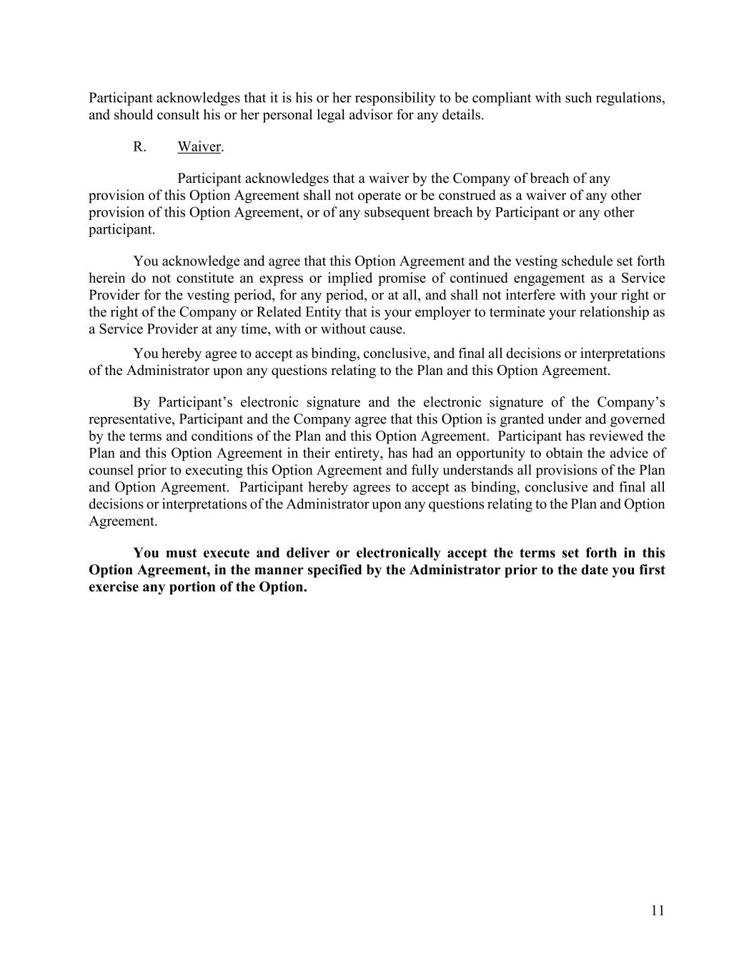 11 Participant acknowledges that it is his or her responsibility to be compliant with such regulations, and should consult his or her personal legal advisor for any details. R. Waiver. Participant acknowledges that a waiver by the Company of breach of any provision of this Option Agreement shall not operate or be construed as a waiver of any other provision of this Option Agreement, or of any subsequent breach by Participant or any other participant. You acknowledge and agree that this Option Agreement and the vesting schedule set forth herein do not constitute an express or implied promise of continued engagement as a Service Provider for the vesting period, for any period, or at all, and shall not interfere with your right or the right of the Company or Related Entity that is your employer to terminate your relationship as a Service Provider at any time, with or without cause. You hereby agree to accept as binding, conclusive, and final all decisions or interpretations of the Administrator upon any questions relating to the Plan and this Option Agreement. By Participant’s electronic signature and the electronic signature of the Company’s representative, Participant and the Company agree that this Option is granted under and governed by the terms and conditions of the Plan and this Option Agreement. Participant has reviewed the Plan and this Option Agreement in their entirety, has had an opportunity to obtain the advice of counsel prior to executing this Option Agreement and fully understands all provisions of the Plan and Option Agreement. Participant hereby agrees to accept as binding, conclusive and final all decisions or interpretations of the Administrator upon any questions relating to the Plan and Option Agreement. You must execute and deliver or electronically accept the terms set forth in this Option Agreement, in the manner specified by the Administrator prior to the date you first exercise any portion of the Option.
