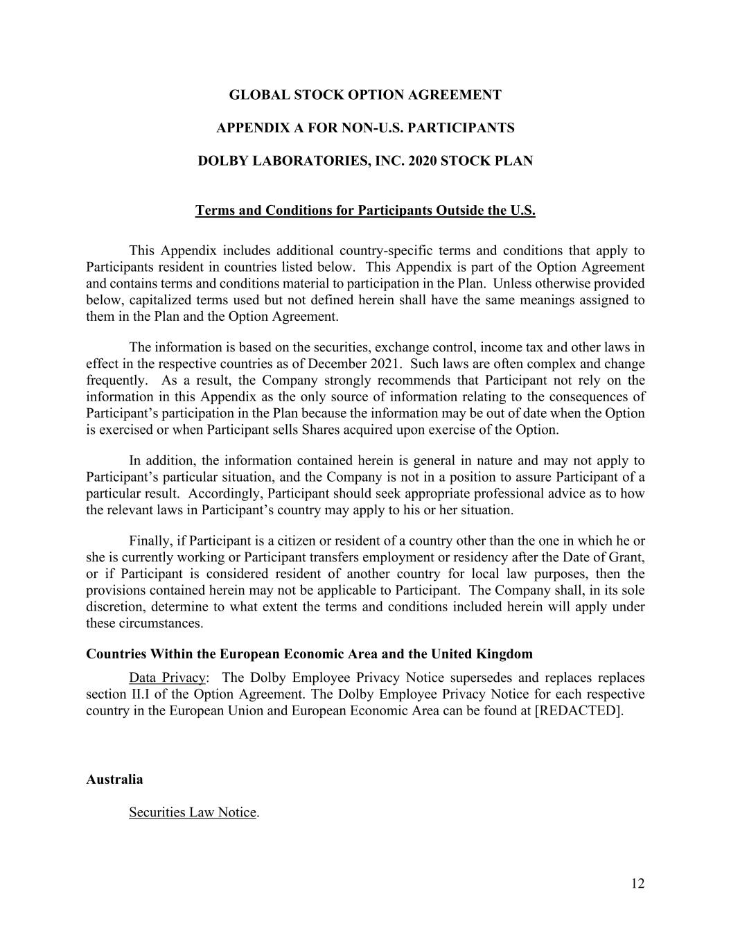 12 GLOBAL STOCK OPTION AGREEMENT APPENDIX A FOR NON-U.S. PARTICIPANTS DOLBY LABORATORIES, INC. 2020 STOCK PLAN Terms and Conditions for Participants Outside the U.S. This Appendix includes additional country-specific terms and conditions that apply to Participants resident in countries listed below. This Appendix is part of the Option Agreement and contains terms and conditions material to participation in the Plan. Unless otherwise provided below, capitalized terms used but not defined herein shall have the same meanings assigned to them in the Plan and the Option Agreement. The information is based on the securities, exchange control, income tax and other laws in effect in the respective countries as of December 2021. Such laws are often complex and change frequently. As a result, the Company strongly recommends that Participant not rely on the information in this Appendix as the only source of information relating to the consequences of Participant’s participation in the Plan because the information may be out of date when the Option is exercised or when Participant sells Shares acquired upon exercise of the Option. In addition, the information contained herein is general in nature and may not apply to Participant’s particular situation, and the Company is not in a position to assure Participant of a particular result. Accordingly, Participant should seek appropriate professional advice as to how the relevant laws in Participant’s country may apply to his or her situation. Finally, if Participant is a citizen or resident of a country other than the one in which he or she is currently working or Participant transfers employment or residency after the Date of Grant, or if Participant is considered resident of another country for local law purposes, then the provisions contained herein may not be applicable to Participant. The Company shall, in its sole discretion, determine to what extent the terms and conditions included herein will apply under these circumstances. Countries Within the European Economic Area and the United Kingdom Data Privacy: The Dolby Employee Privacy Notice supersedes and replaces replaces section II.I of the Option Agreement. The Dolby Employee Privacy Notice for each respective country in the European Union and European Economic Area can be found at [REDACTED]. Australia Securities Law Notice.