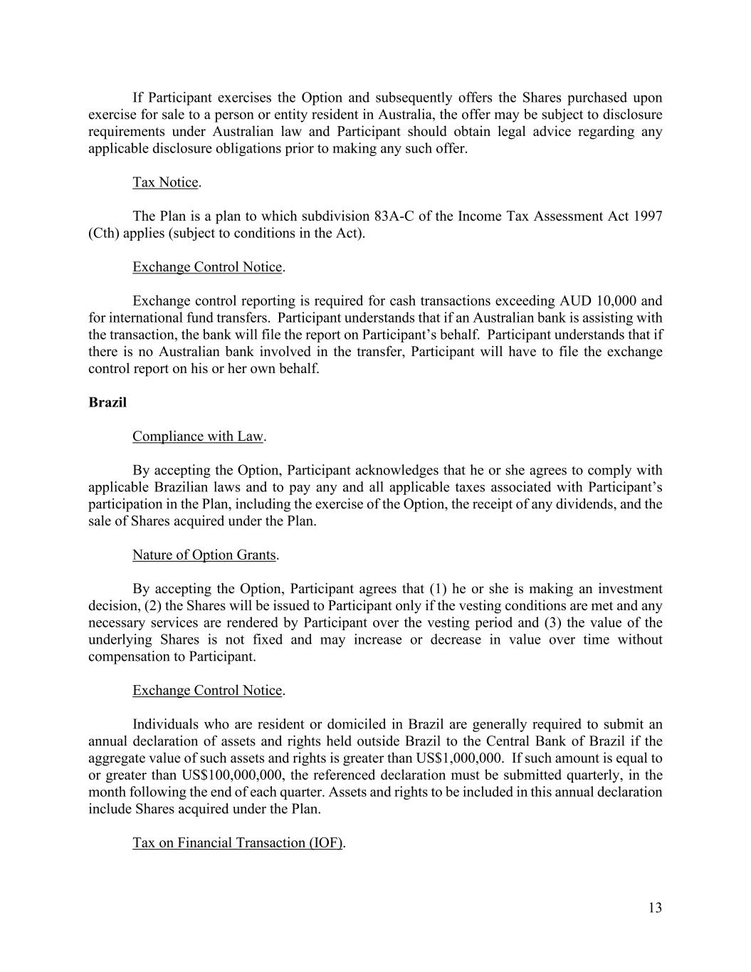 13 If Participant exercises the Option and subsequently offers the Shares purchased upon exercise for sale to a person or entity resident in Australia, the offer may be subject to disclosure requirements under Australian law and Participant should obtain legal advice regarding any applicable disclosure obligations prior to making any such offer. Tax Notice. The Plan is a plan to which subdivision 83A-C of the Income Tax Assessment Act 1997 (Cth) applies (subject to conditions in the Act). Exchange Control Notice. Exchange control reporting is required for cash transactions exceeding AUD 10,000 and for international fund transfers. Participant understands that if an Australian bank is assisting with the transaction, the bank will file the report on Participant’s behalf. Participant understands that if there is no Australian bank involved in the transfer, Participant will have to file the exchange control report on his or her own behalf. Brazil Compliance with Law. By accepting the Option, Participant acknowledges that he or she agrees to comply with applicable Brazilian laws and to pay any and all applicable taxes associated with Participant’s participation in the Plan, including the exercise of the Option, the receipt of any dividends, and the sale of Shares acquired under the Plan. Nature of Option Grants. By accepting the Option, Participant agrees that (1) he or she is making an investment decision, (2) the Shares will be issued to Participant only if the vesting conditions are met and any necessary services are rendered by Participant over the vesting period and (3) the value of the underlying Shares is not fixed and may increase or decrease in value over time without compensation to Participant. Exchange Control Notice. Individuals who are resident or domiciled in Brazil are generally required to submit an annual declaration of assets and rights held outside Brazil to the Central Bank of Brazil if the aggregate value of such assets and rights is greater than US$1,000,000. If such amount is equal to or greater than US$100,000,000, the referenced declaration must be submitted quarterly, in the month following the end of each quarter. Assets and rights to be included in this annual declaration include Shares acquired under the Plan. Tax on Financial Transaction (IOF).