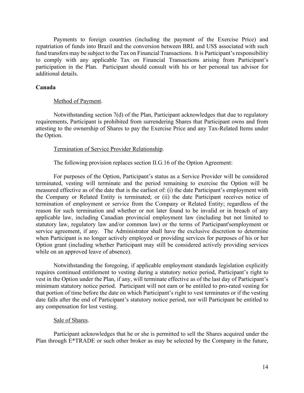 14 Payments to foreign countries (including the payment of the Exercise Price) and repatriation of funds into Brazil and the conversion between BRL and US$ associated with such fund transfers may be subject to the Tax on Financial Transactions. It is Participant’s responsibility to comply with any applicable Tax on Financial Transactions arising from Participant’s participation in the Plan. Participant should consult with his or her personal tax advisor for additional details. Canada Method of Payment. Notwithstanding section 7(d) of the Plan, Participant acknowledges that due to regulatory requirements, Participant is prohibited from surrendering Shares that Participant owns and from attesting to the ownership of Shares to pay the Exercise Price and any Tax-Related Items under the Option. Termination of Service Provider Relationship. The following provision replaces section II.G.16 of the Option Agreement: For purposes of the Option, Participant’s status as a Service Provider will be considered terminated, vesting will terminate and the period remaining to exercise the Option will be measured effective as of the date that is the earliest of: (i) the date Participant’s employment with the Company or Related Entity is terminated; or (ii) the date Participant receives notice of termination of employment or service from the Company or Related Entity; regardless of the reason for such termination and whether or not later found to be invalid or in breach of any applicable law, including Canadian provincial employment law (including but not limited to statutory law, regulatory law and/or common law) or the terms of Participant'semployment or service agreement, if any. The Administrator shall have the exclusive discretion to determine when Participant is no longer actively employed or providing services for purposes of his or her Option grant (including whether Participant may still be considered actively providing services while on an approved leave of absence). Notwithstanding the foregoing, if applicable employment standards legislation explicitly requires continued entitlement to vesting during a statutory notice period, Participant’s right to vest in the Option under the Plan, if any, will terminate effective as of the last day of Participant’s minimum statutory notice period. Participant will not earn or be entitled to pro-rated vesting for that portion of time before the date on which Participant’s right to vest terminates or if the vesting date falls after the end of Participant’s statutory notice period, nor will Participant be entitled to any compensation for lost vesting. Sale of Shares. Participant acknowledges that he or she is permitted to sell the Shares acquired under the Plan through E*TRADE or such other broker as may be selected by the Company in the future,
