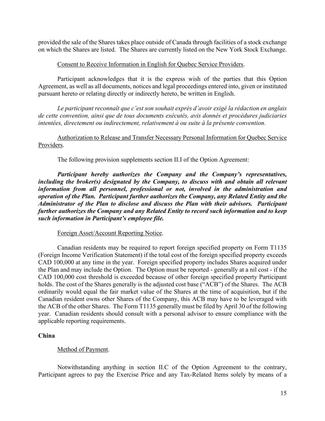 15 provided the sale of the Shares takes place outside of Canada through facilities of a stock exchange on which the Shares are listed. The Shares are currently listed on the New York Stock Exchange. Consent to Receive Information in English for Quebec Service Providers. Participant acknowledges that it is the express wish of the parties that this Option Agreement, as well as all documents, notices and legal proceedings entered into, given or instituted pursuant hereto or relating directly or indirectly hereto, be written in English. Le participant reconnaît que c’est son souhait exprès d’avoir exigé la rédaction en anglais de cette convention, ainsi que de tous documents exécutés, avis donnés et procédures judiciaries intentées, directement ou indirectement, relativement à ou suite à la présente convention. Authorization to Release and Transfer Necessary Personal Information for Quebec Service Providers. The following provision supplements section II.I of the Option Agreement: Participant hereby authorizes the Company and the Company’s representatives, including the broker(s) designated by the Company, to discuss with and obtain all relevant information from all personnel, professional or not, involved in the administration and operation of the Plan. Participant further authorizes the Company, any Related Entity and the Administrator of the Plan to disclose and discuss the Plan with their advisors. Participant further authorizes the Company and any Related Entity to record such information and to keep such information in Participant’s employee file. Foreign Asset/Account Reporting Notice. Canadian residents may be required to report foreign specified property on Form T1135 (Foreign Income Verification Statement) if the total cost of the foreign specified property exceeds CAD 100,000 at any time in the year. Foreign specified property includes Shares acquired under the Plan and may include the Option. The Option must be reported - generally at a nil cost - if the CAD 100,000 cost threshold is exceeded because of other foreign specified property Participant holds. The cost of the Shares generally is the adjusted cost base (“ACB”) of the Shares. The ACB ordinarily would equal the fair market value of the Shares at the time of acquisition, but if the Canadian resident owns other Shares of the Company, this ACB may have to be leveraged with the ACB of the other Shares. The Form T1135 generally must be filed by April 30 of the following year. Canadian residents should consult with a personal advisor to ensure compliance with the applicable reporting requirements. China Method of Payment. Notwithstanding anything in section II.C of the Option Agreement to the contrary, Participant agrees to pay the Exercise Price and any Tax-Related Items solely by means of a