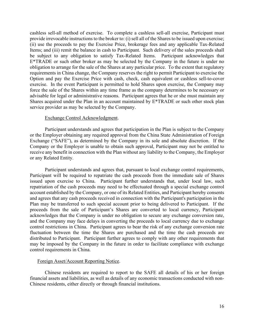 16 cashless sell-all method of exercise. To complete a cashless sell-all exercise, Participant must provide irrevocable instructions to the broker to: (i) sell all of the Shares to be issued upon exercise; (ii) use the proceeds to pay the Exercise Price, brokerage fees and any applicable Tax-Related Items; and (iii) remit the balance in cash to Participant. Such delivery of the sales proceeds shall be subject to any obligation to satisfy Tax-Related Items. Participant acknowledges that E*TRADE or such other broker as may be selected by the Company in the future is under no obligation to arrange for the sale of the Shares at any particular price. To the extent that regulatory requirements in China change, the Company reserves the right to permit Participant to exercise the Option and pay the Exercise Price with cash, check, cash equivalent or cashless sell-to-cover exercise. In the event Participant is permitted to hold Shares upon exercise, the Company may force the sale of the Shares within any time frame as the company determines to be necessary or advisable for legal or administrative reasons. Participant agrees that he or she must maintain any Shares acquired under the Plan in an account maintained by E*TRADE or such other stock plan service provider as may be selected by the Company. Exchange Control Acknowledgment. Participant understands and agrees that participation in the Plan is subject to the Company or the Employer obtaining any required approval from the China State Administration of Foreign Exchange (“SAFE”), as determined by the Company in its sole and absolute discretion. If the Company or the Employer is unable to obtain such approval, Participant may not be entitled to receive any benefit in connection with the Plan without any liability to the Company, the Employer or any Related Entity. Participant understands and agrees that, pursuant to local exchange control requirements, Participant will be required to repatriate the cash proceeds from the immediate sale of Shares issued upon exercise to China. Participant further understands that, under local law, such repatriation of the cash proceeds may need to be effectuated through a special exchange control account established by the Company, or one of its Related Entities, and Participant hereby consents and agrees that any cash proceeds received in connection with the Participant's participation in the Plan may be transferred to such special account prior to being delivered to Participant. If the proceeds from the sale of Participant’s Shares are converted to local currency, Participant acknowledges that the Company is under no obligation to secure any exchange conversion rate, and the Company may face delays in converting the proceeds to local currency due to exchange control restrictions in China. Participant agrees to bear the risk of any exchange conversion rate fluctuation between the time the Shares are purchased and the time the cash proceeds are distributed to Participant. Participant further agrees to comply with any other requirements that may be imposed by the Company in the future in order to facilitate compliance with exchange control requirements in China. Foreign Asset/Account Reporting Notice. Chinese residents are required to report to the SAFE all details of his or her foreign financial assets and liabilities, as well as details of any economic transactions conducted with non- Chinese residents, either directly or through financial institutions.