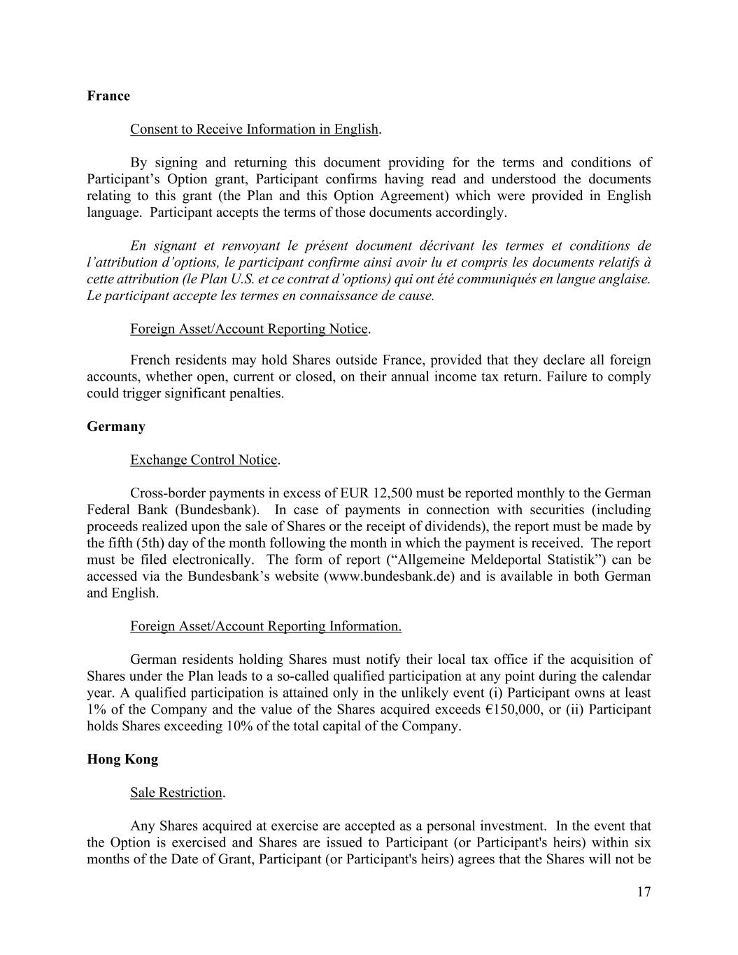 17 France Consent to Receive Information in English. By signing and returning this document providing for the terms and conditions of Participant’s Option grant, Participant confirms having read and understood the documents relating to this grant (the Plan and this Option Agreement) which were provided in English language. Participant accepts the terms of those documents accordingly. En signant et renvoyant le présent document décrivant les termes et conditions de l’attribution d’options, le participant confirme ainsi avoir lu et compris les documents relatifs à cette attribution (le Plan U.S. et ce contrat d’options) qui ont été communiqués en langue anglaise. Le participant accepte les termes en connaissance de cause. Foreign Asset/Account Reporting Notice. French residents may hold Shares outside France, provided that they declare all foreign accounts, whether open, current or closed, on their annual income tax return. Failure to comply could trigger significant penalties. Germany Exchange Control Notice. Cross-border payments in excess of EUR 12,500 must be reported monthly to the German Federal Bank (Bundesbank). In case of payments in connection with securities (including proceeds realized upon the sale of Shares or the receipt of dividends), the report must be made by the fifth (5th) day of the month following the month in which the payment is received. The report must be filed electronically. The form of report (“Allgemeine Meldeportal Statistik”) can be accessed via the Bundesbank’s website (www.bundesbank.de) and is available in both German and English. Foreign Asset/Account Reporting Information. German residents holding Shares must notify their local tax office if the acquisition of Shares under the Plan leads to a so-called qualified participation at any point during the calendar year. A qualified participation is attained only in the unlikely event (i) Participant owns at least 1% of the Company and the value of the Shares acquired exceeds €150,000, or (ii) Participant holds Shares exceeding 10% of the total capital of the Company. Hong Kong Sale Restriction. Any Shares acquired at exercise are accepted as a personal investment. In the event that the Option is exercised and Shares are issued to Participant (or Participant's heirs) within six months of the Date of Grant, Participant (or Participant's heirs) agrees that the Shares will not be