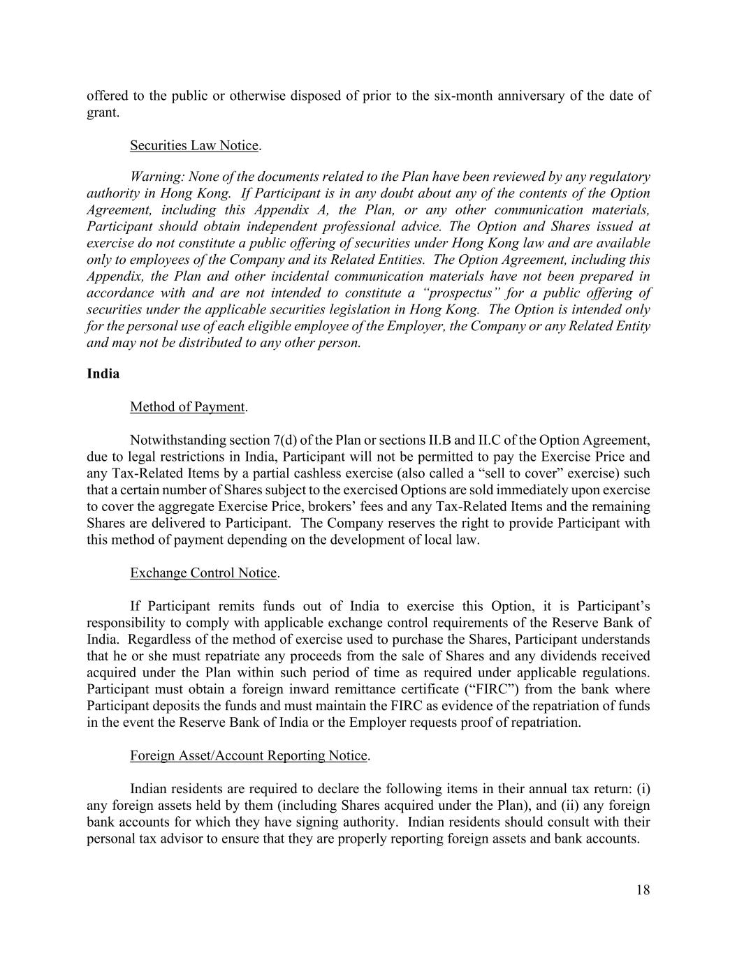 18 offered to the public or otherwise disposed of prior to the six-month anniversary of the date of grant. Securities Law Notice. Warning: None of the documents related to the Plan have been reviewed by any regulatory authority in Hong Kong. If Participant is in any doubt about any of the contents of the Option Agreement, including this Appendix A, the Plan, or any other communication materials, Participant should obtain independent professional advice. The Option and Shares issued at exercise do not constitute a public offering of securities under Hong Kong law and are available only to employees of the Company and its Related Entities. The Option Agreement, including this Appendix, the Plan and other incidental communication materials have not been prepared in accordance with and are not intended to constitute a “prospectus” for a public offering of securities under the applicable securities legislation in Hong Kong. The Option is intended only for the personal use of each eligible employee of the Employer, the Company or any Related Entity and may not be distributed to any other person. India Method of Payment. Notwithstanding section 7(d) of the Plan or sections II.B and II.C of the Option Agreement, due to legal restrictions in India, Participant will not be permitted to pay the Exercise Price and any Tax-Related Items by a partial cashless exercise (also called a “sell to cover” exercise) such that a certain number of Shares subject to the exercised Options are sold immediately upon exercise to cover the aggregate Exercise Price, brokers’ fees and any Tax-Related Items and the remaining Shares are delivered to Participant. The Company reserves the right to provide Participant with this method of payment depending on the development of local law. Exchange Control Notice. If Participant remits funds out of India to exercise this Option, it is Participant’s responsibility to comply with applicable exchange control requirements of the Reserve Bank of India. Regardless of the method of exercise used to purchase the Shares, Participant understands that he or she must repatriate any proceeds from the sale of Shares and any dividends received acquired under the Plan within such period of time as required under applicable regulations. Participant must obtain a foreign inward remittance certificate (“FIRC”) from the bank where Participant deposits the funds and must maintain the FIRC as evidence of the repatriation of funds in the event the Reserve Bank of India or the Employer requests proof of repatriation. Foreign Asset/Account Reporting Notice. Indian residents are required to declare the following items in their annual tax return: (i) any foreign assets held by them (including Shares acquired under the Plan), and (ii) any foreign bank accounts for which they have signing authority. Indian residents should consult with their personal tax advisor to ensure that they are properly reporting foreign assets and bank accounts.