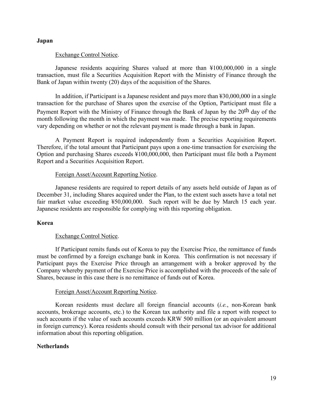 19 Japan Exchange Control Notice. Japanese residents acquiring Shares valued at more than ¥100,000,000 in a single transaction, must file a Securities Acquisition Report with the Ministry of Finance through the Bank of Japan within twenty (20) days of the acquisition of the Shares. In addition, if Participant is a Japanese resident and pays more than ¥30,000,000 in a single transaction for the purchase of Shares upon the exercise of the Option, Participant must file a Payment Report with the Ministry of Finance through the Bank of Japan by the 20th day of the month following the month in which the payment was made. The precise reporting requirements vary depending on whether or not the relevant payment is made through a bank in Japan. A Payment Report is required independently from a Securities Acquisition Report. Therefore, if the total amount that Participant pays upon a one-time transaction for exercising the Option and purchasing Shares exceeds ¥100,000,000, then Participant must file both a Payment Report and a Securities Acquisition Report. Foreign Asset/Account Reporting Notice. Japanese residents are required to report details of any assets held outside of Japan as of December 31, including Shares acquired under the Plan, to the extent such assets have a total net fair market value exceeding ¥50,000,000. Such report will be due by March 15 each year. Japanese residents are responsible for complying with this reporting obligation. Korea Exchange Control Notice. If Participant remits funds out of Korea to pay the Exercise Price, the remittance of funds must be confirmed by a foreign exchange bank in Korea. This confirmation is not necessary if Participant pays the Exercise Price through an arrangement with a broker approved by the Company whereby payment of the Exercise Price is accomplished with the proceeds of the sale of Shares, because in this case there is no remittance of funds out of Korea. Foreign Asset/Account Reporting Notice. Korean residents must declare all foreign financial accounts (i.e., non-Korean bank accounts, brokerage accounts, etc.) to the Korean tax authority and file a report with respect to such accounts if the value of such accounts exceeds KRW 500 million (or an equivalent amount in foreign currency). Korea residents should consult with their personal tax advisor for additional information about this reporting obligation. Netherlands