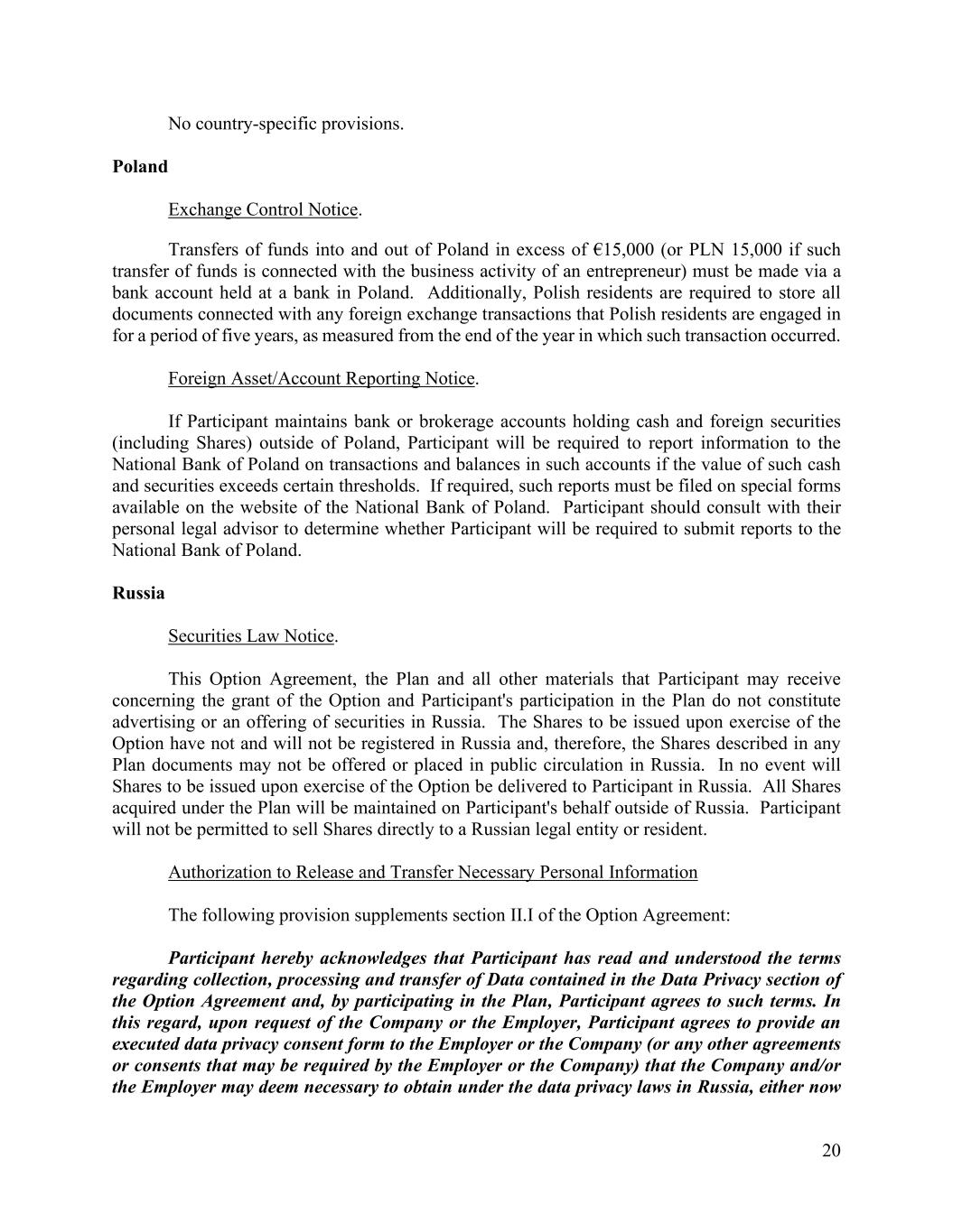 20 No country-specific provisions. Poland Exchange Control Notice. Transfers of funds into and out of Poland in excess of €15,000 (or PLN 15,000 if such transfer of funds is connected with the business activity of an entrepreneur) must be made via a bank account held at a bank in Poland. Additionally, Polish residents are required to store all documents connected with any foreign exchange transactions that Polish residents are engaged in for a period of five years, as measured from the end of the year in which such transaction occurred. Foreign Asset/Account Reporting Notice. If Participant maintains bank or brokerage accounts holding cash and foreign securities (including Shares) outside of Poland, Participant will be required to report information to the National Bank of Poland on transactions and balances in such accounts if the value of such cash and securities exceeds certain thresholds. If required, such reports must be filed on special forms available on the website of the National Bank of Poland. Participant should consult with their personal legal advisor to determine whether Participant will be required to submit reports to the National Bank of Poland. Russia Securities Law Notice. This Option Agreement, the Plan and all other materials that Participant may receive concerning the grant of the Option and Participant's participation in the Plan do not constitute advertising or an offering of securities in Russia. The Shares to be issued upon exercise of the Option have not and will not be registered in Russia and, therefore, the Shares described in any Plan documents may not be offered or placed in public circulation in Russia. In no event will Shares to be issued upon exercise of the Option be delivered to Participant in Russia. All Shares acquired under the Plan will be maintained on Participant's behalf outside of Russia. Participant will not be permitted to sell Shares directly to a Russian legal entity or resident. Authorization to Release and Transfer Necessary Personal Information The following provision supplements section II.I of the Option Agreement: Participant hereby acknowledges that Participant has read and understood the terms regarding collection, processing and transfer of Data contained in the Data Privacy section of the Option Agreement and, by participating in the Plan, Participant agrees to such terms. In this regard, upon request of the Company or the Employer, Participant agrees to provide an executed data privacy consent form to the Employer or the Company (or any other agreements or consents that may be required by the Employer or the Company) that the Company and/or the Employer may deem necessary to obtain under the data privacy laws in Russia, either now