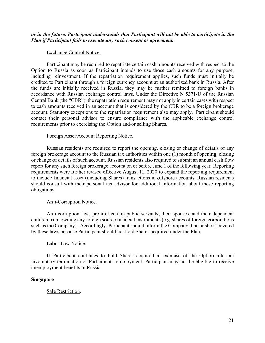 21 or in the future. Participant understands that Participant will not be able to participate in the Plan if Participant fails to execute any such consent or agreement. Exchange Control Notice. Participant may be required to repatriate certain cash amounts received with respect to the Option to Russia as soon as Participant intends to use those cash amounts for any purpose, including reinvestment. If the repatriation requirement applies, such funds must initially be credited to Participant through a foreign currency account at an authorized bank in Russia. After the funds are initially received in Russia, they may be further remitted to foreign banks in accordance with Russian exchange control laws. Under the Directive N 5371-U of the Russian Central Bank (the “CBR”), the repatriation requirement may not apply in certain cases with respect to cash amounts received in an account that is considered by the CBR to be a foreign brokerage account. Statutory exceptions to the repatriation requirement also may apply. Participant should contact their personal advisor to ensure compliance with the applicable exchange control requirements prior to exercising the Option and/or selling Shares. Foreign Asset/Account Reporting Notice. Russian residents are required to report the opening, closing or change of details of any foreign brokerage account to the Russian tax authorities within one (1) month of opening, closing or change of details of such account. Russian residents also required to submit an annual cash flow report for any such foreign brokerage account on or before June 1 of the following year. Reporting requirements were further revised effective August 11, 2020 to expand the reporting requirement to include financial asset (including Shares) transactions in offshore accounts. Russian residents should consult with their personal tax advisor for additional information about these reporting obligations. Anti-Corruption Notice. Anti-corruption laws prohibit certain public servants, their spouses, and their dependent children from owning any foreign source financial instruments (e.g. shares of foreign corporations such as the Company). Accordingly, Particpant should inform the Company if he or she is covered by these laws because Participant should not hold Shares acquired under the Plan. Labor Law Notice. If Participant continues to hold Shares acquired at exercise of the Option after an involuntary termination of Participant's employment, Participant may not be eligible to receive unemployment benefits in Russia. Singapore Sale Restriction.