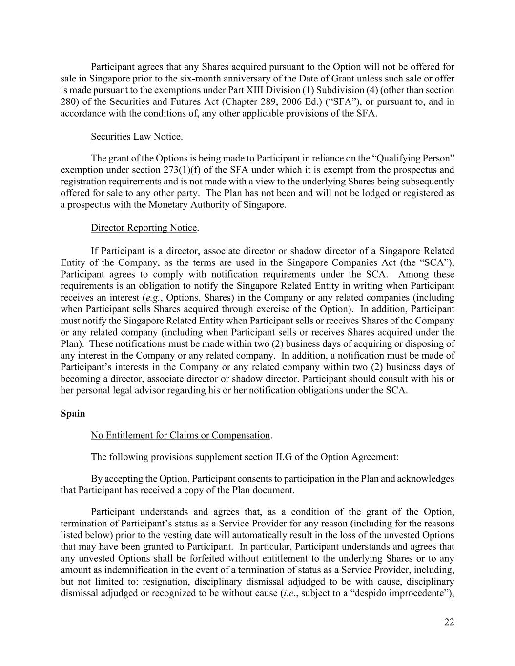 22 Participant agrees that any Shares acquired pursuant to the Option will not be offered for sale in Singapore prior to the six-month anniversary of the Date of Grant unless such sale or offer is made pursuant to the exemptions under Part XIII Division (1) Subdivision (4) (other than section 280) of the Securities and Futures Act (Chapter 289, 2006 Ed.) (“SFA”), or pursuant to, and in accordance with the conditions of, any other applicable provisions of the SFA. Securities Law Notice. The grant of the Options is being made to Participant in reliance on the “Qualifying Person” exemption under section 273(1)(f) of the SFA under which it is exempt from the prospectus and registration requirements and is not made with a view to the underlying Shares being subsequently offered for sale to any other party. The Plan has not been and will not be lodged or registered as a prospectus with the Monetary Authority of Singapore. Director Reporting Notice. If Participant is a director, associate director or shadow director of a Singapore Related Entity of the Company, as the terms are used in the Singapore Companies Act (the “SCA”), Participant agrees to comply with notification requirements under the SCA. Among these requirements is an obligation to notify the Singapore Related Entity in writing when Participant receives an interest (e.g., Options, Shares) in the Company or any related companies (including when Participant sells Shares acquired through exercise of the Option). In addition, Participant must notify the Singapore Related Entity when Participant sells or receives Shares of the Company or any related company (including when Participant sells or receives Shares acquired under the Plan). These notifications must be made within two (2) business days of acquiring or disposing of any interest in the Company or any related company. In addition, a notification must be made of Participant’s interests in the Company or any related company within two (2) business days of becoming a director, associate director or shadow director. Participant should consult with his or her personal legal advisor regarding his or her notification obligations under the SCA. Spain No Entitlement for Claims or Compensation. The following provisions supplement section II.G of the Option Agreement: By accepting the Option, Participant consents to participation in the Plan and acknowledges that Participant has received a copy of the Plan document. Participant understands and agrees that, as a condition of the grant of the Option, termination of Participant’s status as a Service Provider for any reason (including for the reasons listed below) prior to the vesting date will automatically result in the loss of the unvested Options that may have been granted to Participant. In particular, Participant understands and agrees that any unvested Options shall be forfeited without entitlement to the underlying Shares or to any amount as indemnification in the event of a termination of status as a Service Provider, including, but not limited to: resignation, disciplinary dismissal adjudged to be with cause, disciplinary dismissal adjudged or recognized to be without cause (i.e., subject to a “despido improcedente”),